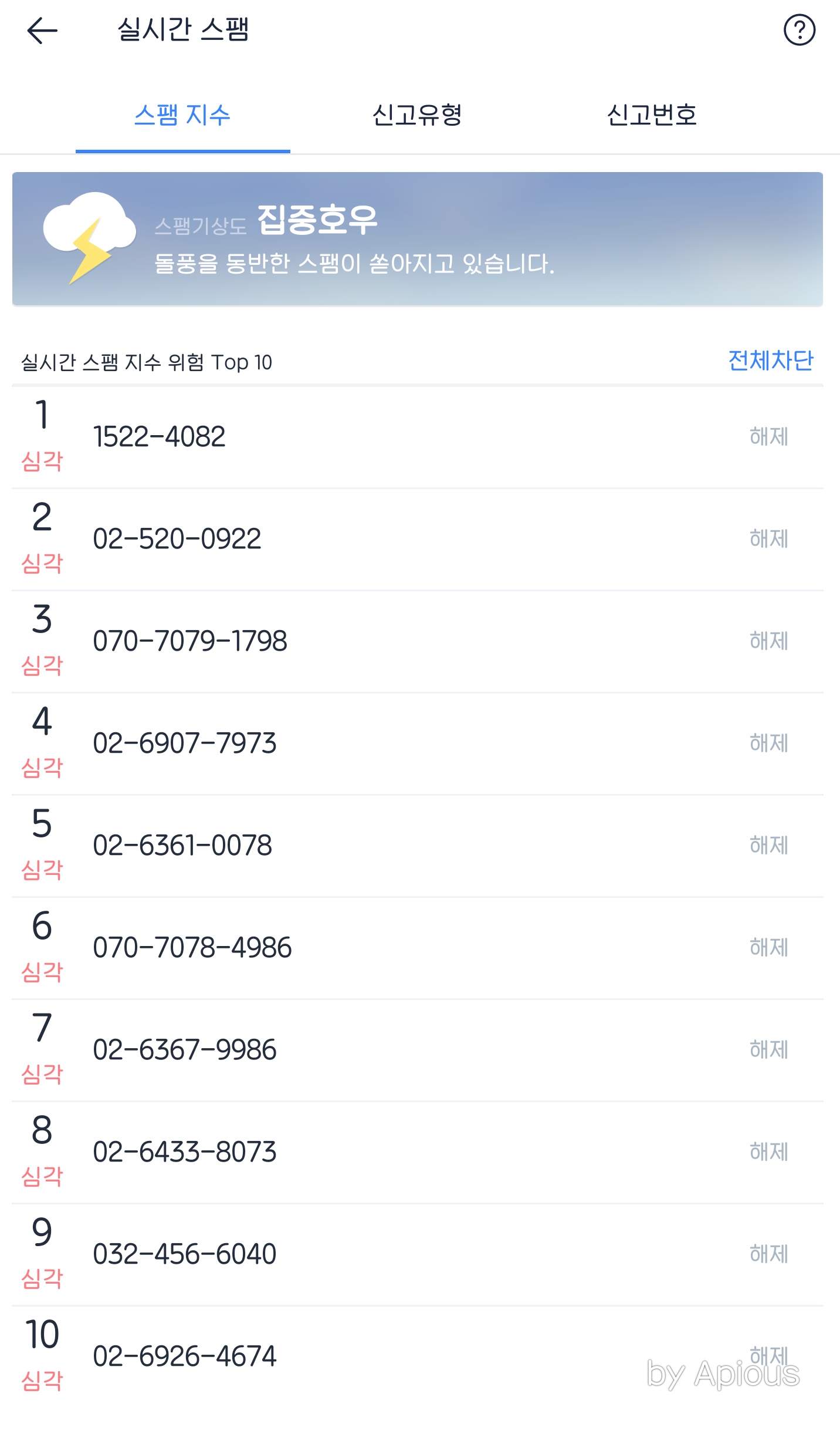5. 한번씩 앱을 열어 아주 가끔씩 [실시간 스팸] 항목에 일괄 차단 적용 / 이전, 최근 신고된 상위 항목입니다.