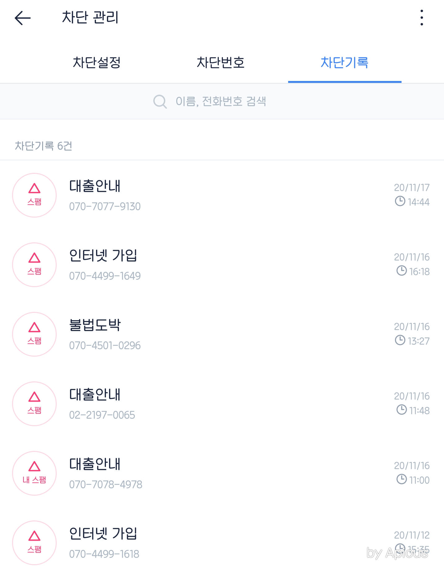 - 사용자가 스팸인 번호를 보고 벨 소리 듣고 차단하는 경우는 여기 탭에 기록되지 않아요