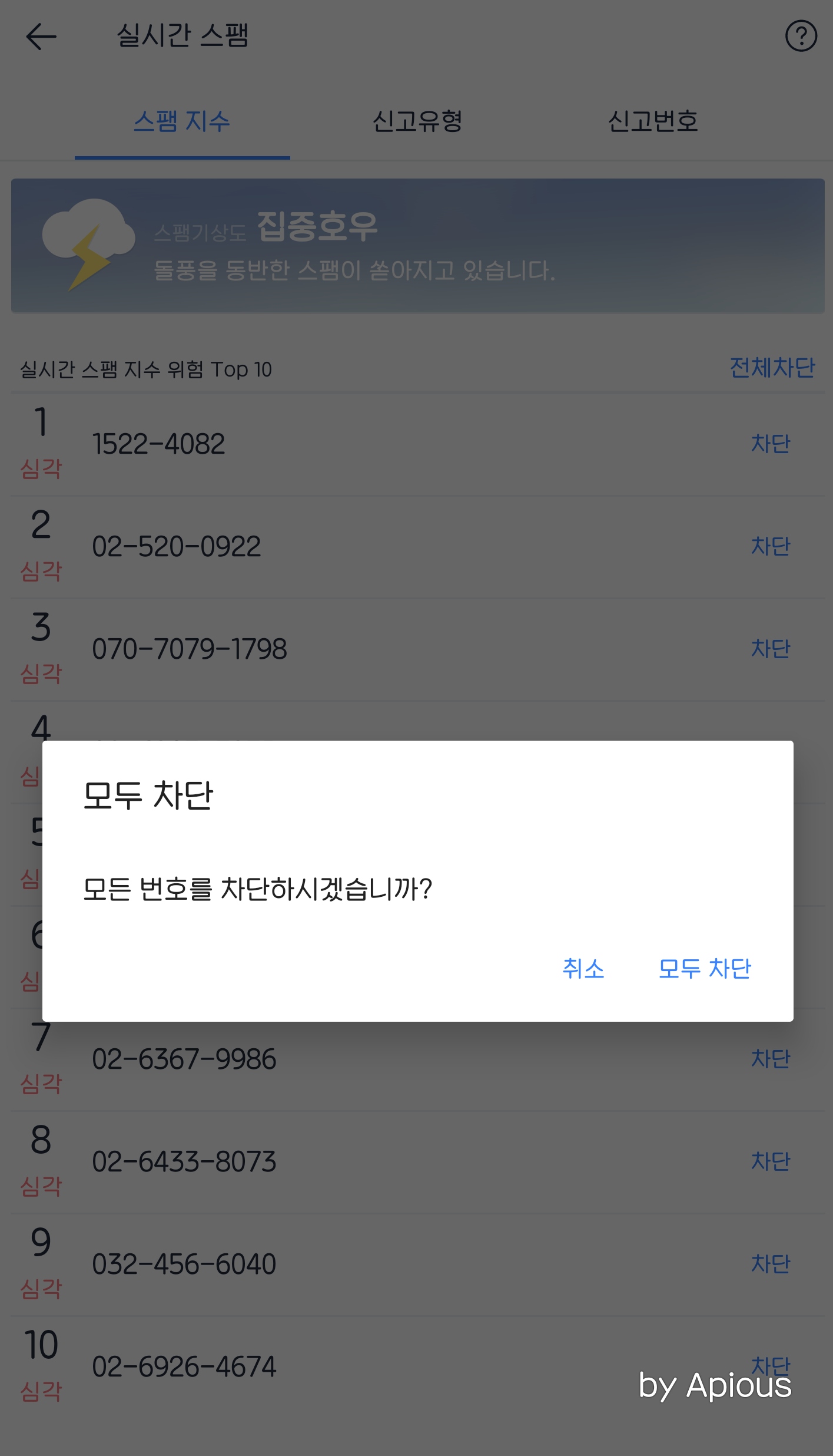5. 한번씩 앱을 열어 아주 가끔씩 [실시간 스팸] 항목에 일괄 차단 적용 / 이전, 최근 신고된 상위 항목입니다.