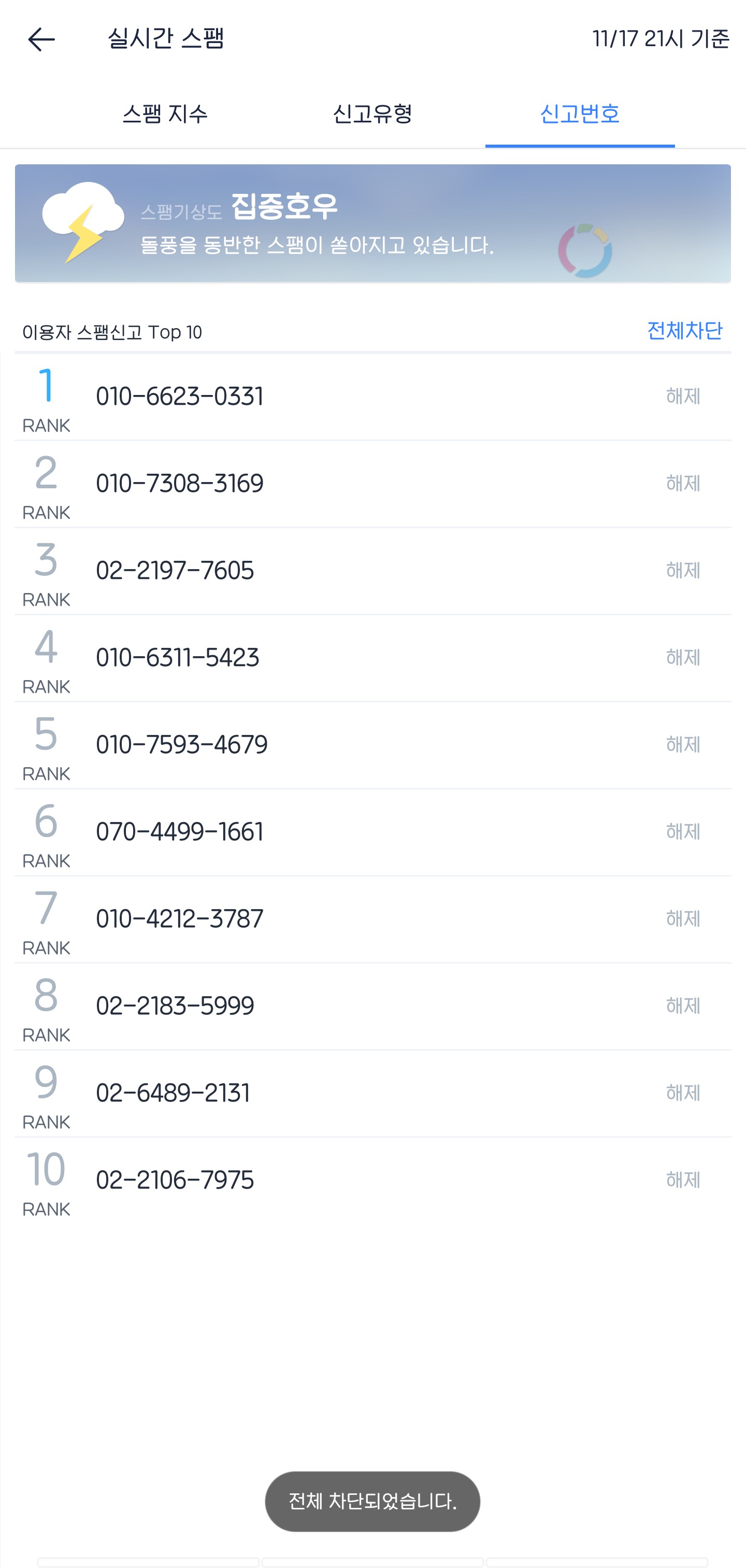 - 하단 토스트(팝업 알림) [전체 차단 되었습니다] 보이죠?