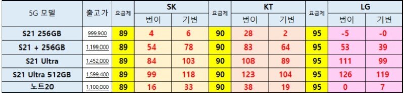 위에 s21 -8 만써 있지만 표를 보면 요금제가 써있습니다