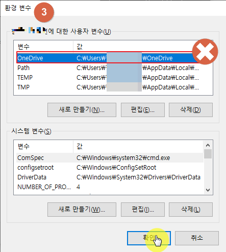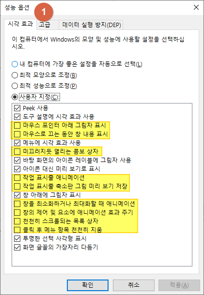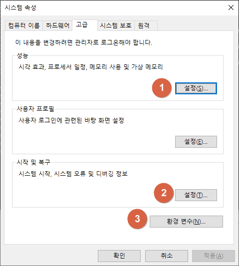 c - 시스템 속성 >> 고급 / 각 번호별 항목에 이미지대로 적용