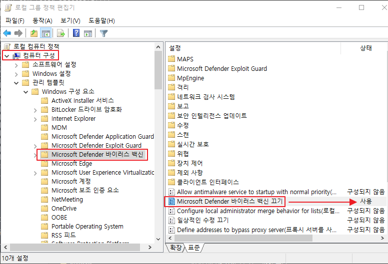 윈도우 항목의 이하 빨간색 칸 처럼 몽땅 "사용안함" 하시고 시스템에 막힌건 굳이 안해도 됩니다