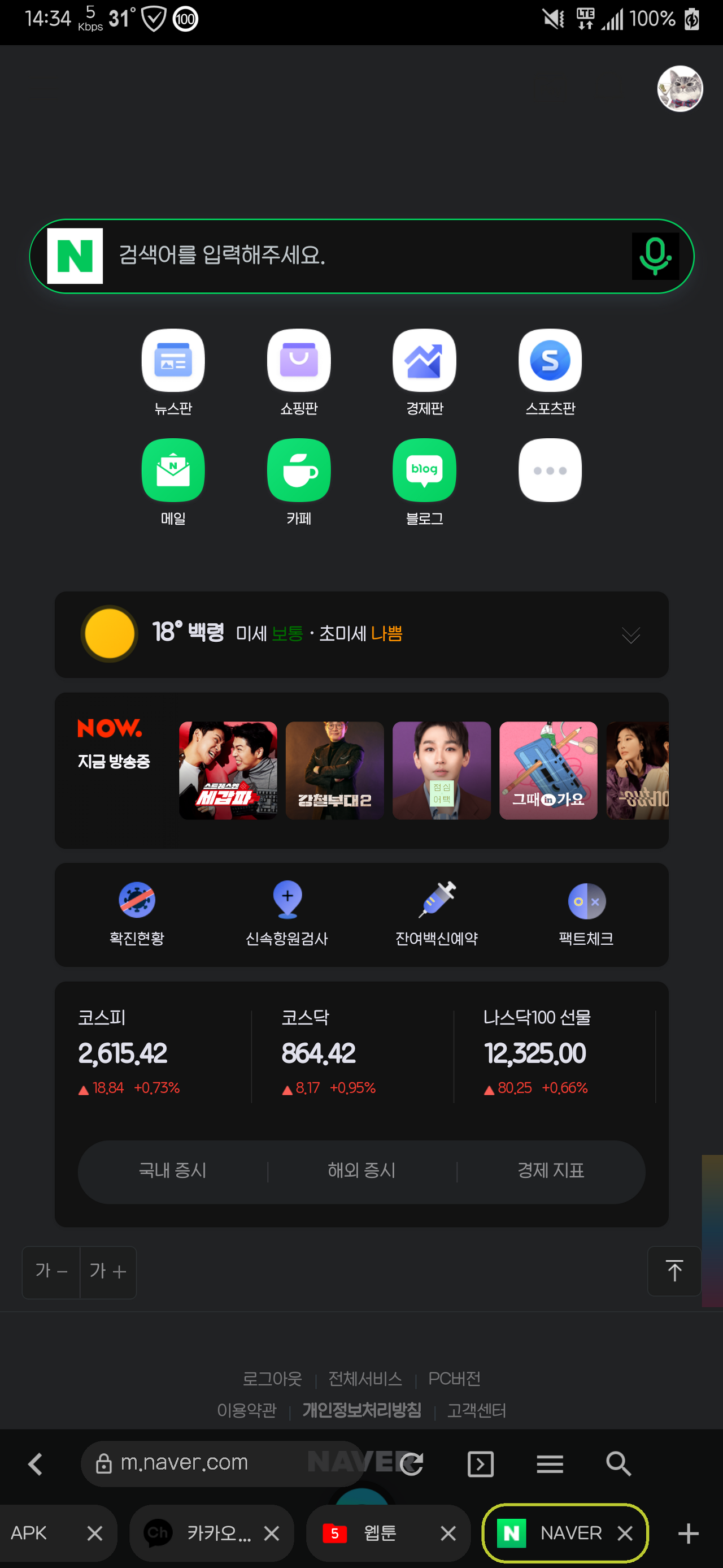 네이버 자체 모바일 홈의 올릴 경우의 추가 메뉴들이 보이네요