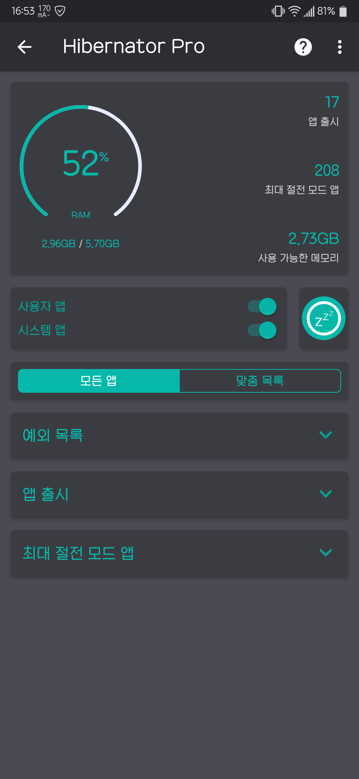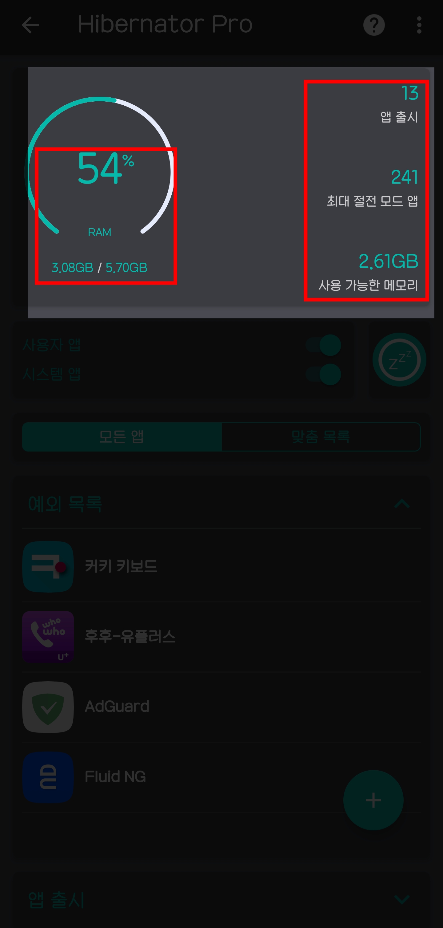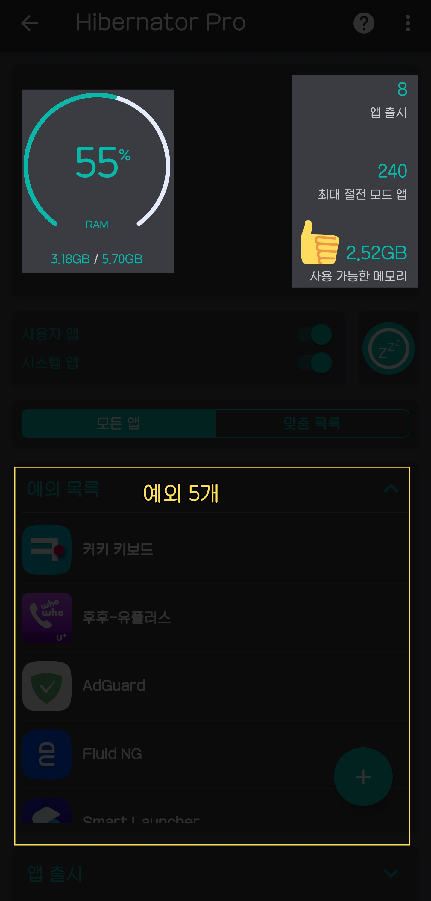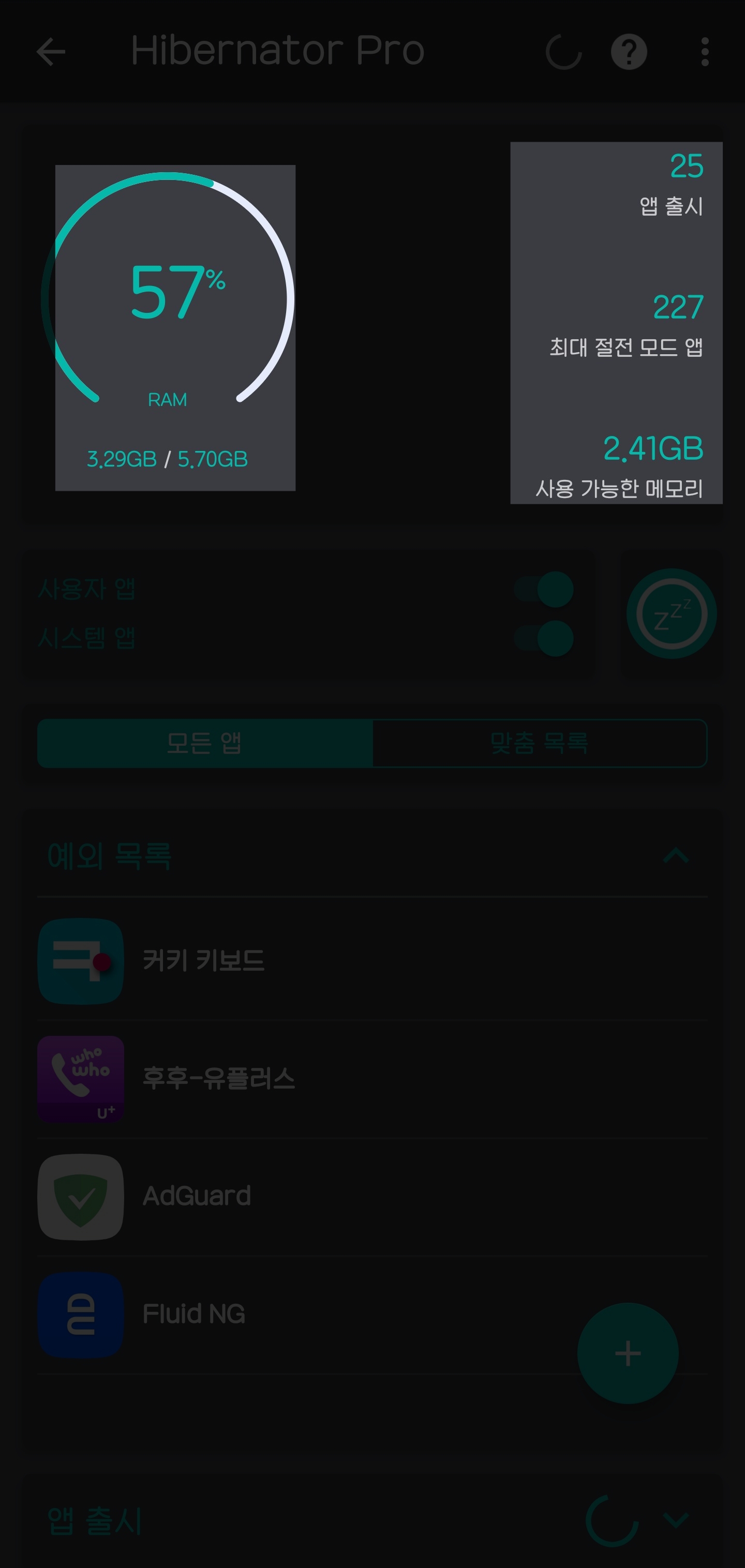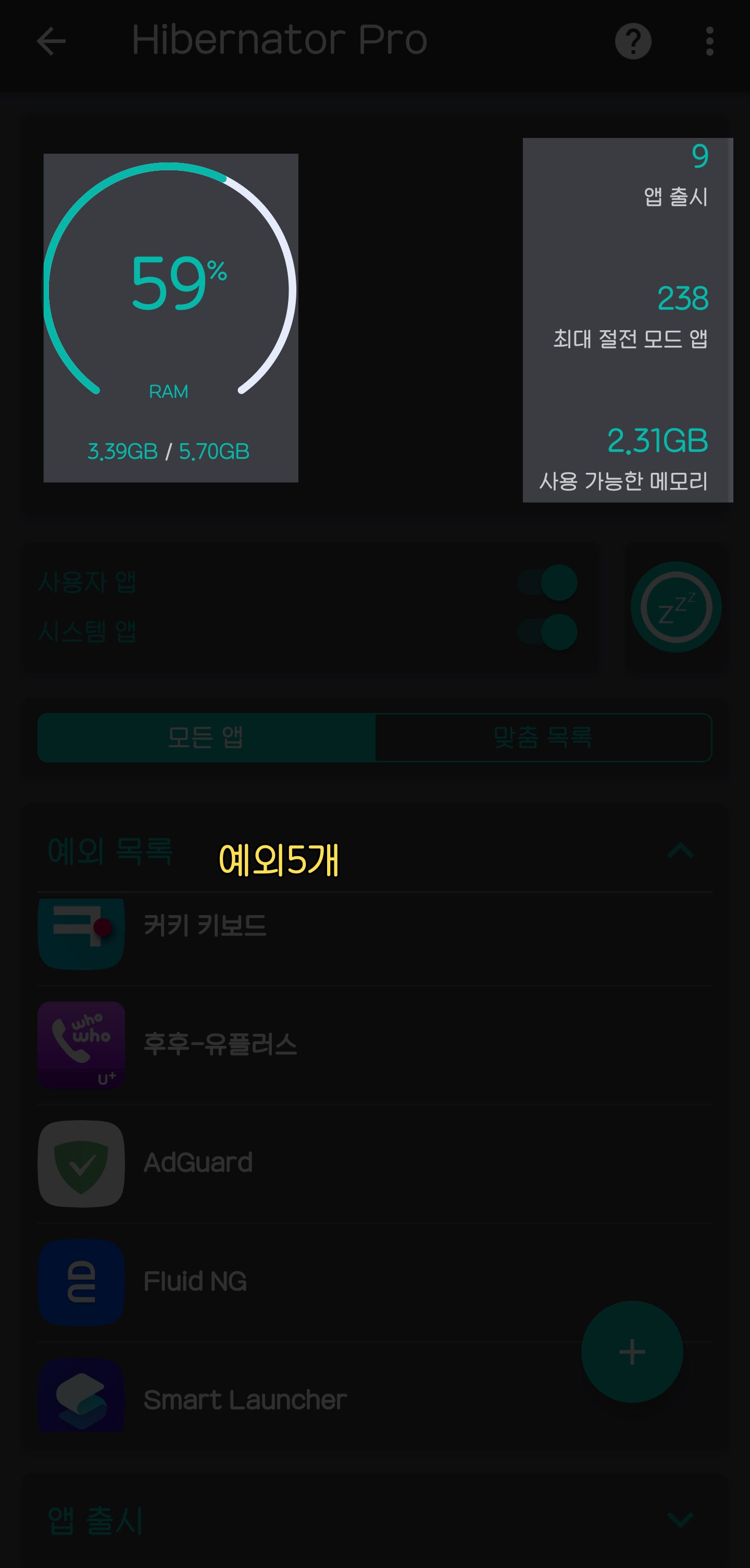 예외 목록의 앱들은 보통 70~200mb 이상 메모리를 먹슴다 매번 바껴서 ㅋ