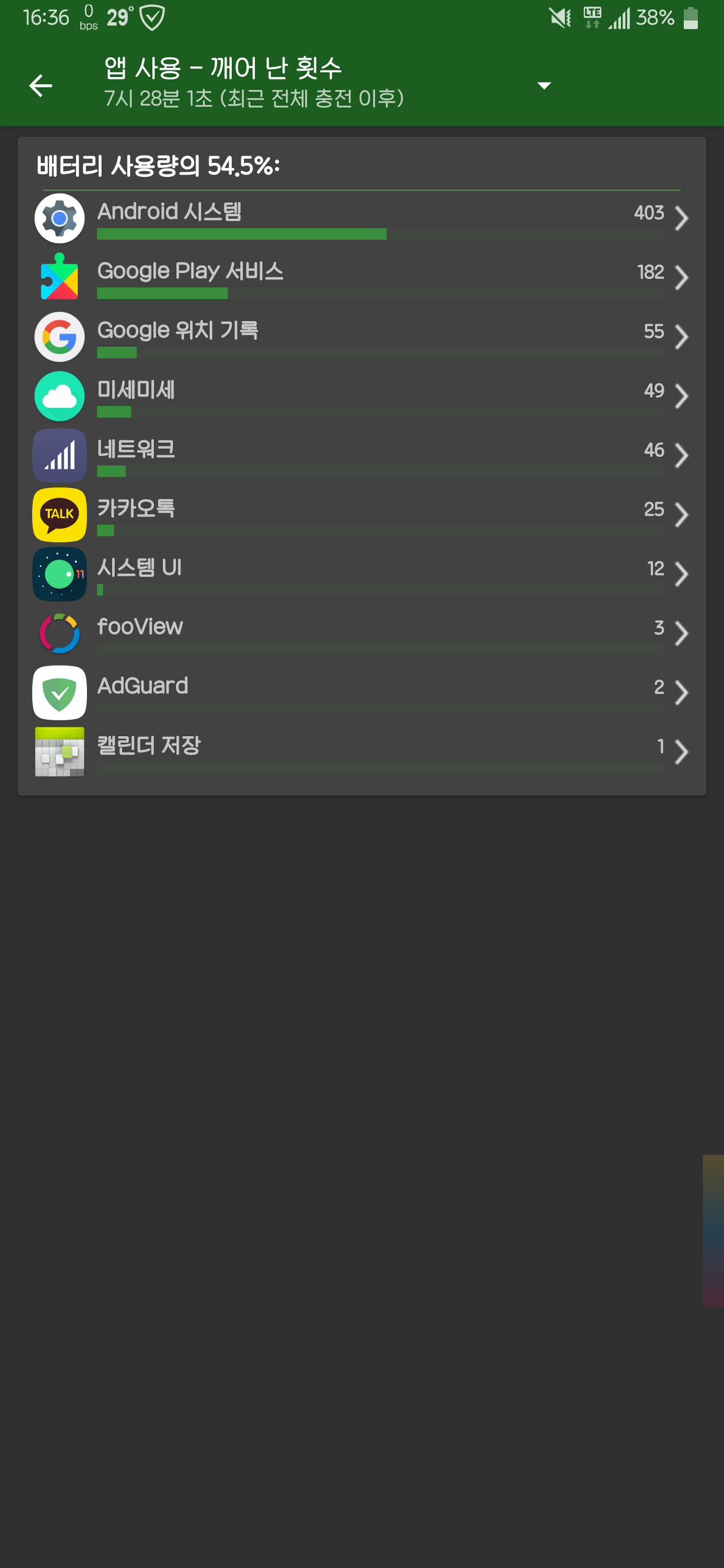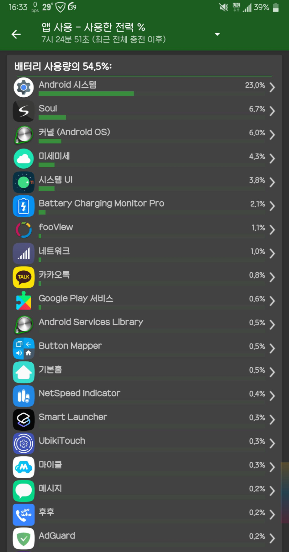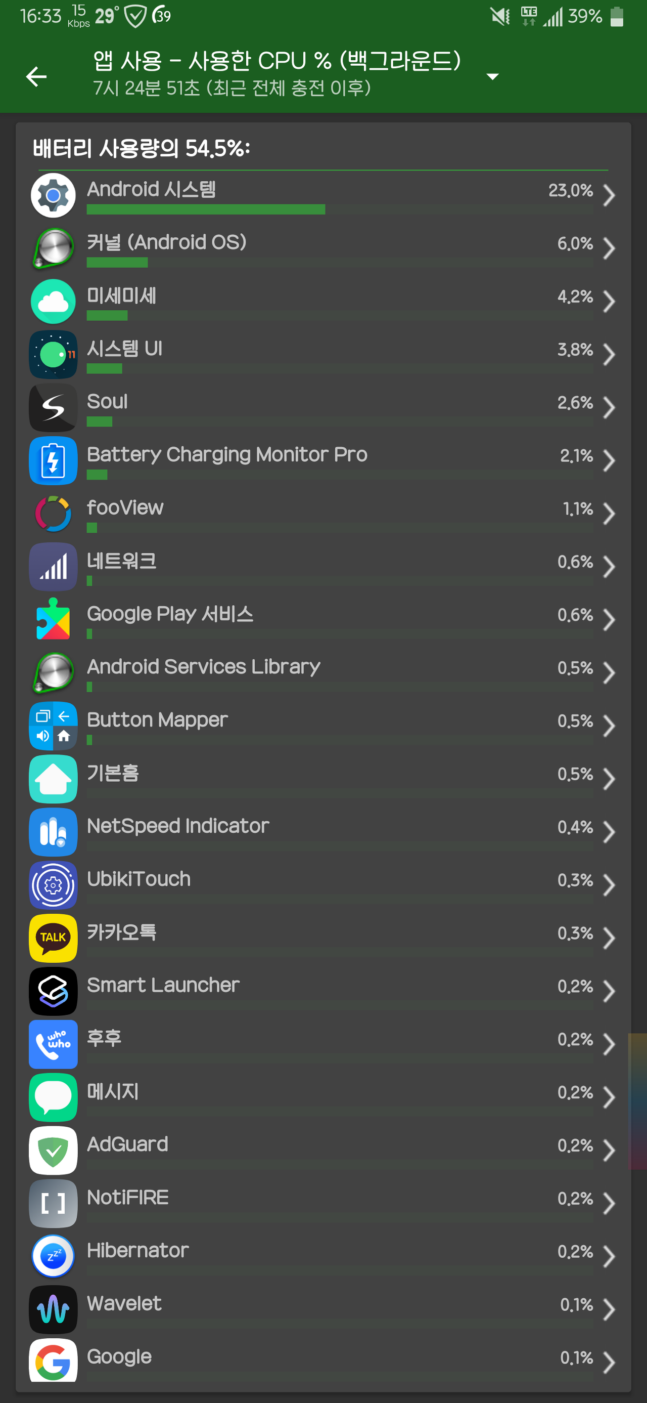 앱 사용량인데 기본 런처는 스마트런처에 항상 켜져 있는건 애드가드, 후후(구버전), 넷스피드 인디케이터(속첵), 버튼 매핑(v50구글버튼), 카톡, Fooview, 배터리차징~(배터리 온도 상태가 상단바에 고정), 미세미세(위젯), 유비키터치(소프트 버튼), 소울브라우저 로 사용합니다