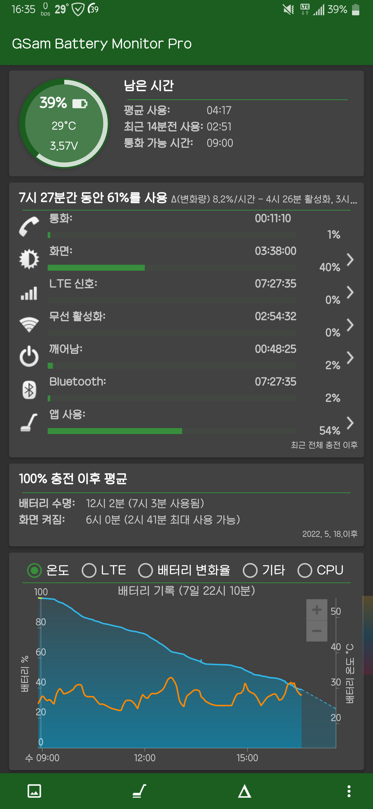 배터리 100퍼 >> 38% 까지 잦은 사용에 기록된 정보와 수치 입니다