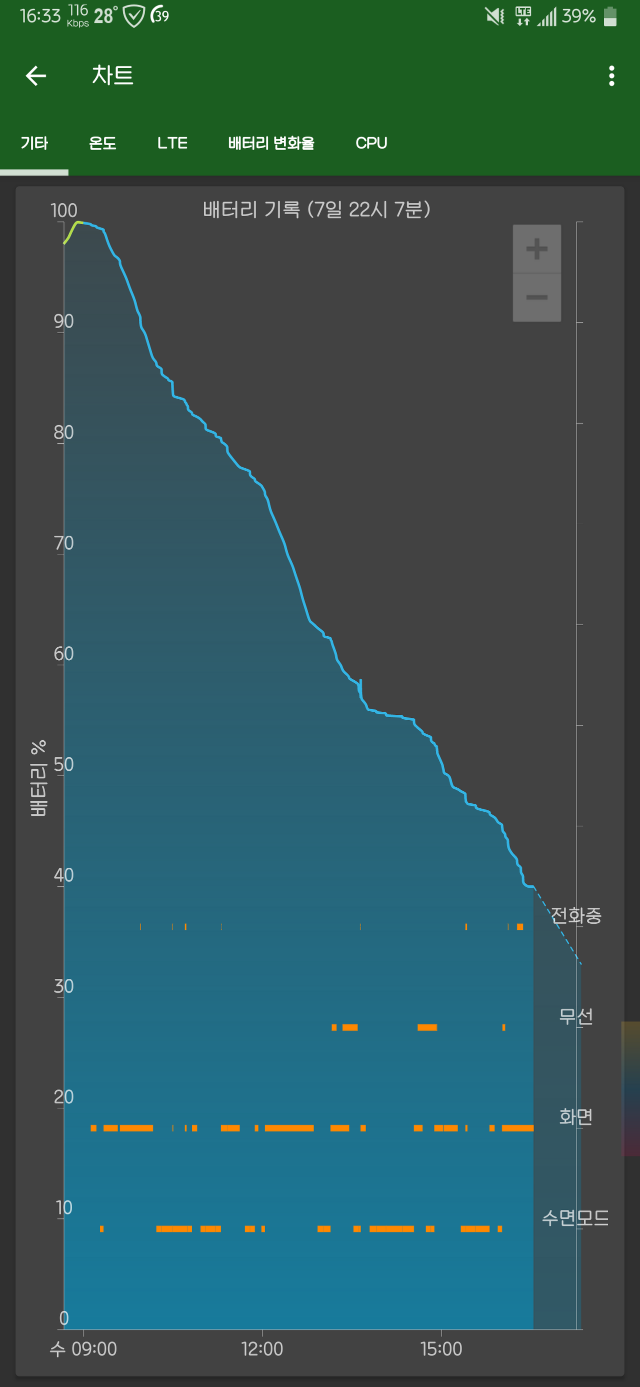 형광 초록 - 충전중인 상태 이후 부터 기록으로 보면 떨어지고 있죠?