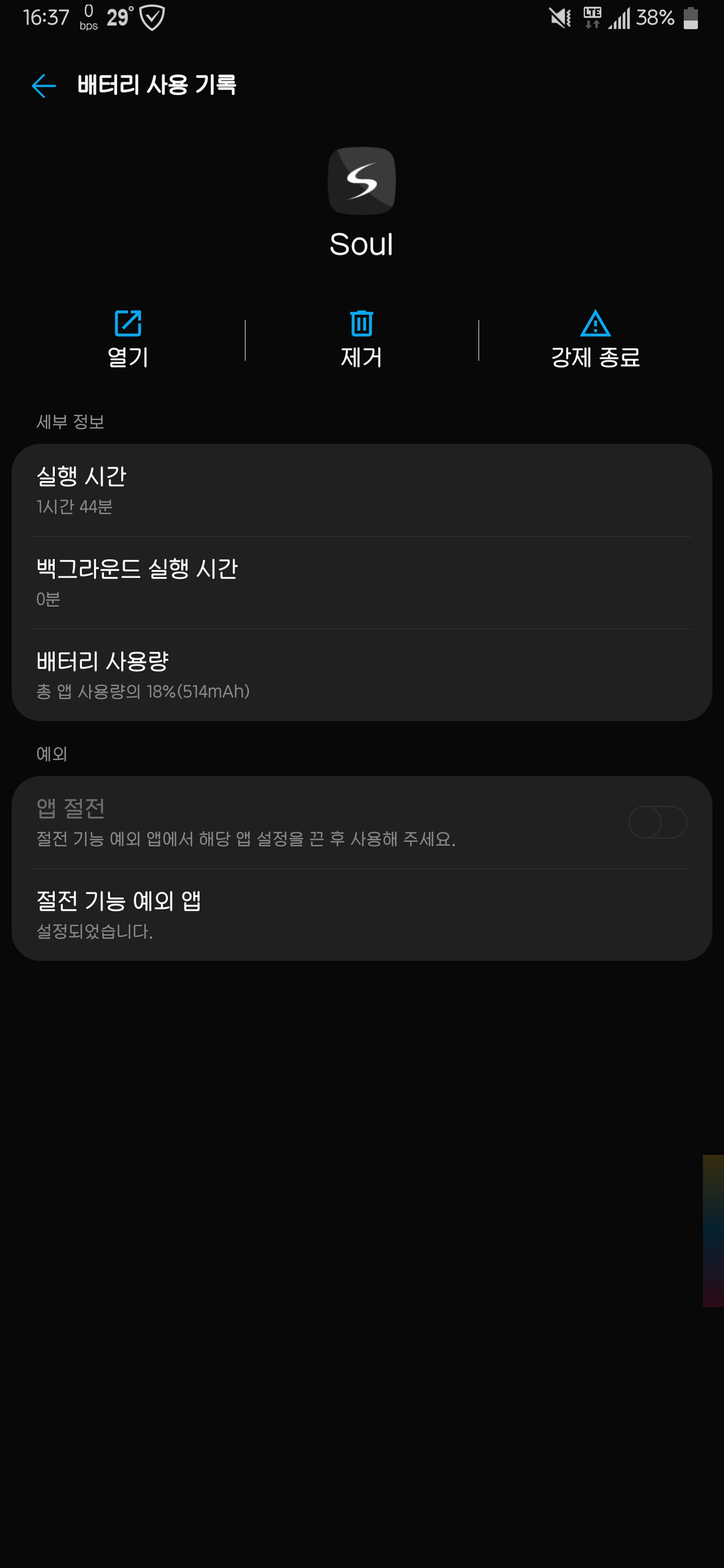 배터리 사용기록(안드 자체 배터리 사용기록) 18%(514mAh) / 실행+백그라운드 기록 사용시간 1시간 44분 집계