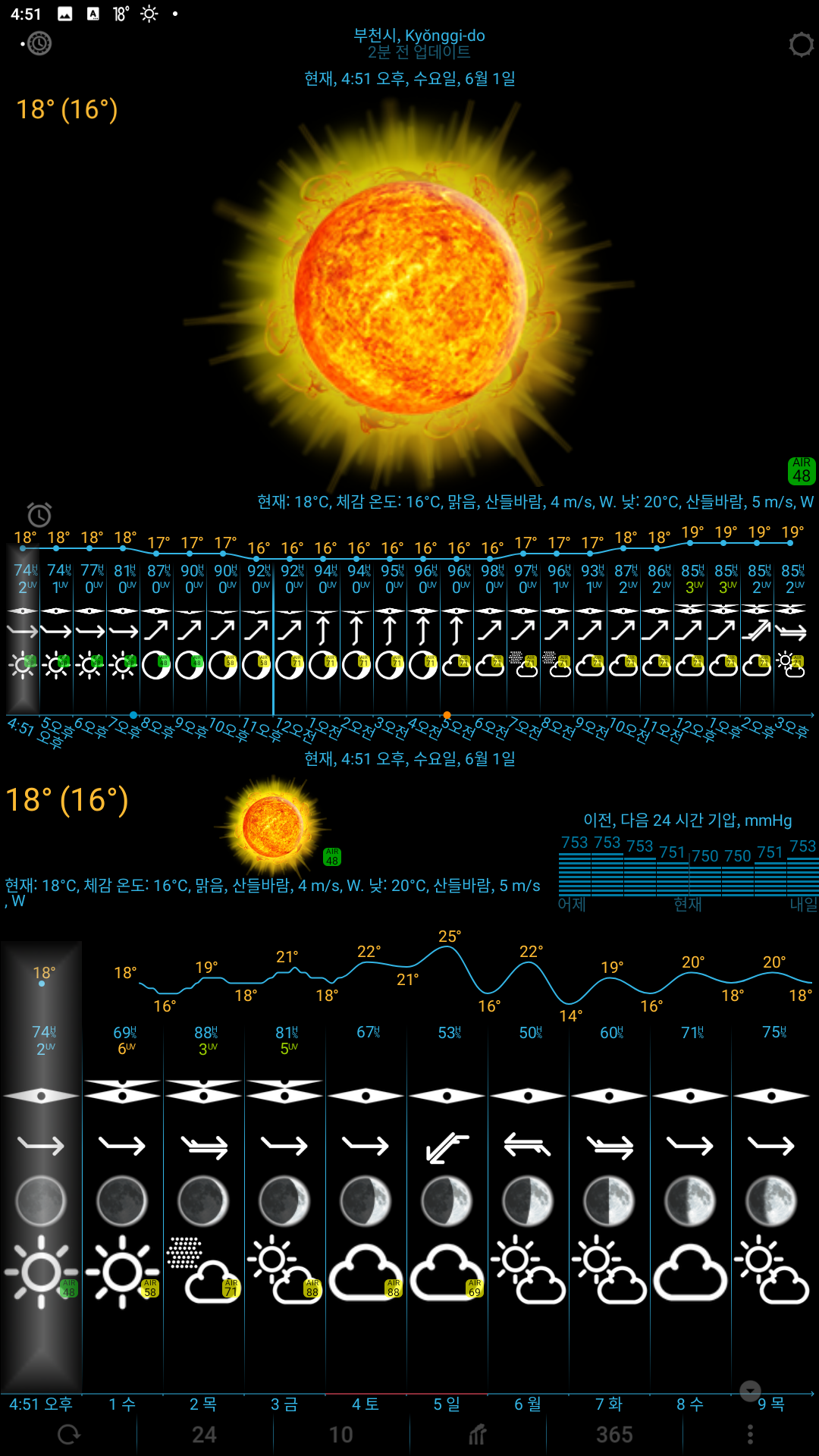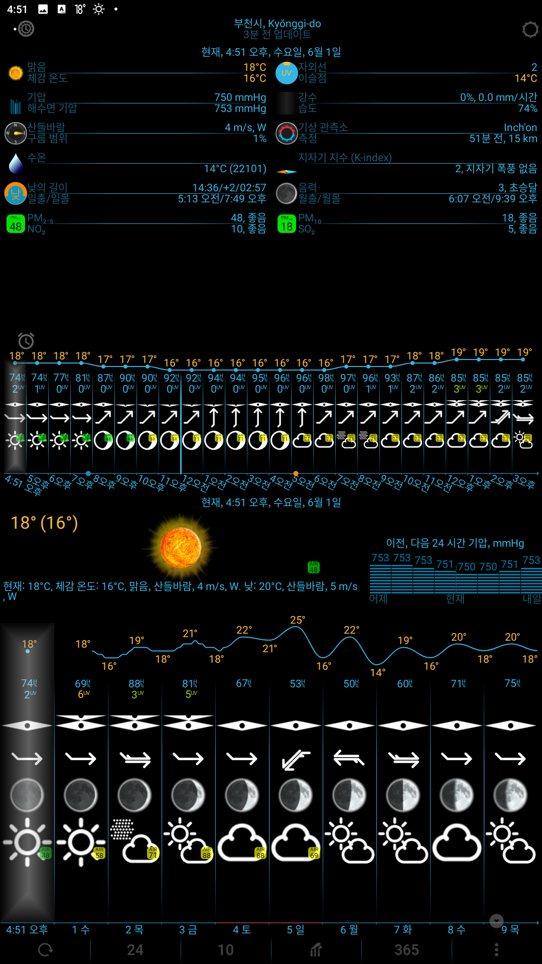 시간, 날짜, 예보, 각각의 자외선이나 바람 위치, 풍량, 그외 바다의 온도나 밀물썰물 등 날씨에 관해 모든 자세한 정보를 한번에 볼수 있는걸 찾았는데 해가 언제뜨고 지고 달 지표나 변화까지도 알수 있는