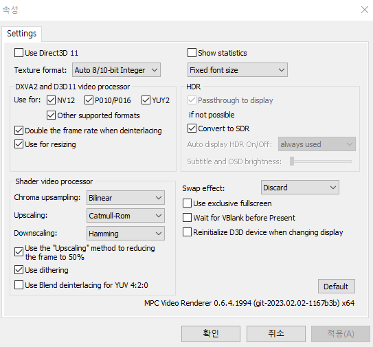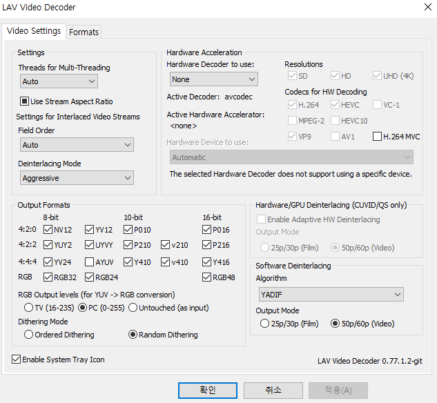 6.1.LAV Video Decoder 저사양 설정이며 고사양의 경우 [ DXVA2 (copy-back) ], SD, HD, UHD, H.264, HEVC, VP9 만 체크 + Software Deinterlacing 항목의 YADIF, Output Mode 를 [ 50p/60p(Video) ] 적용 해주세요.