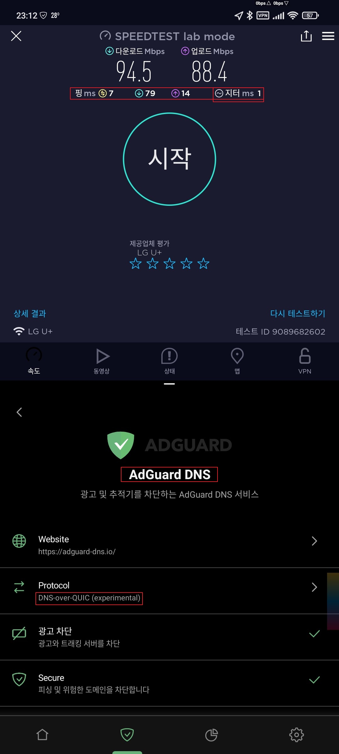 Adguard DNS - 프로토콜 : DNS-Over-QUIC // 시험 단계인데 그닥 괜찮지는 않네요 업다운도 비대칭이고