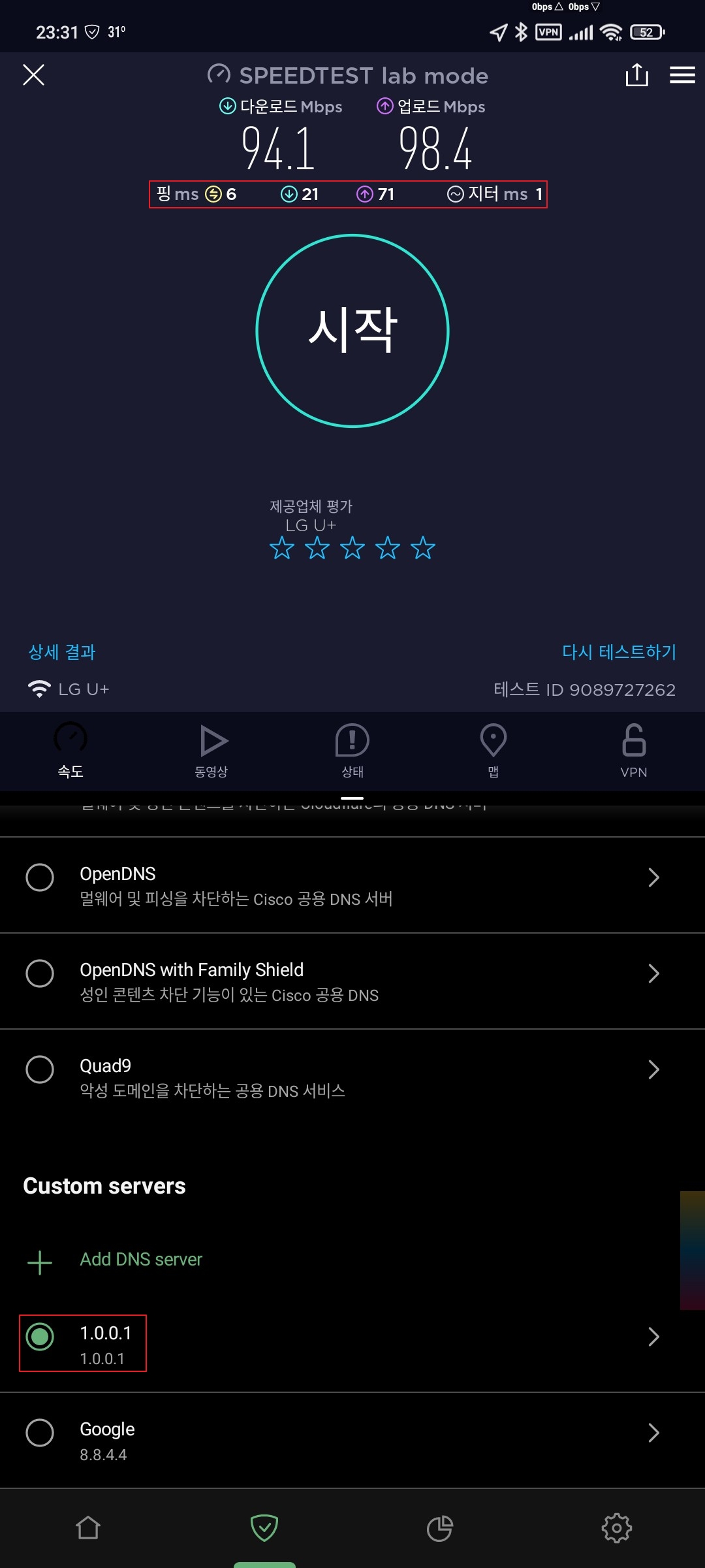 이제 다른 DNS서버를 적용후의 테스트 결과를 보는데