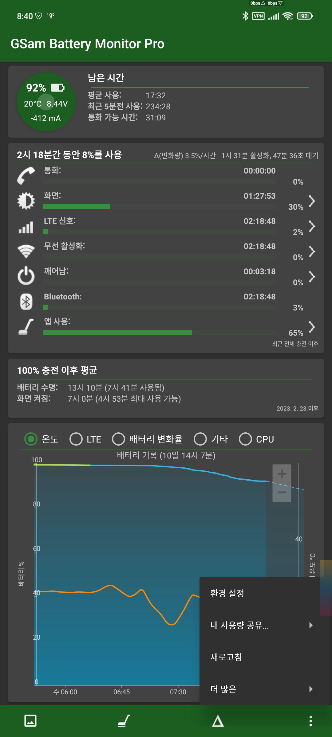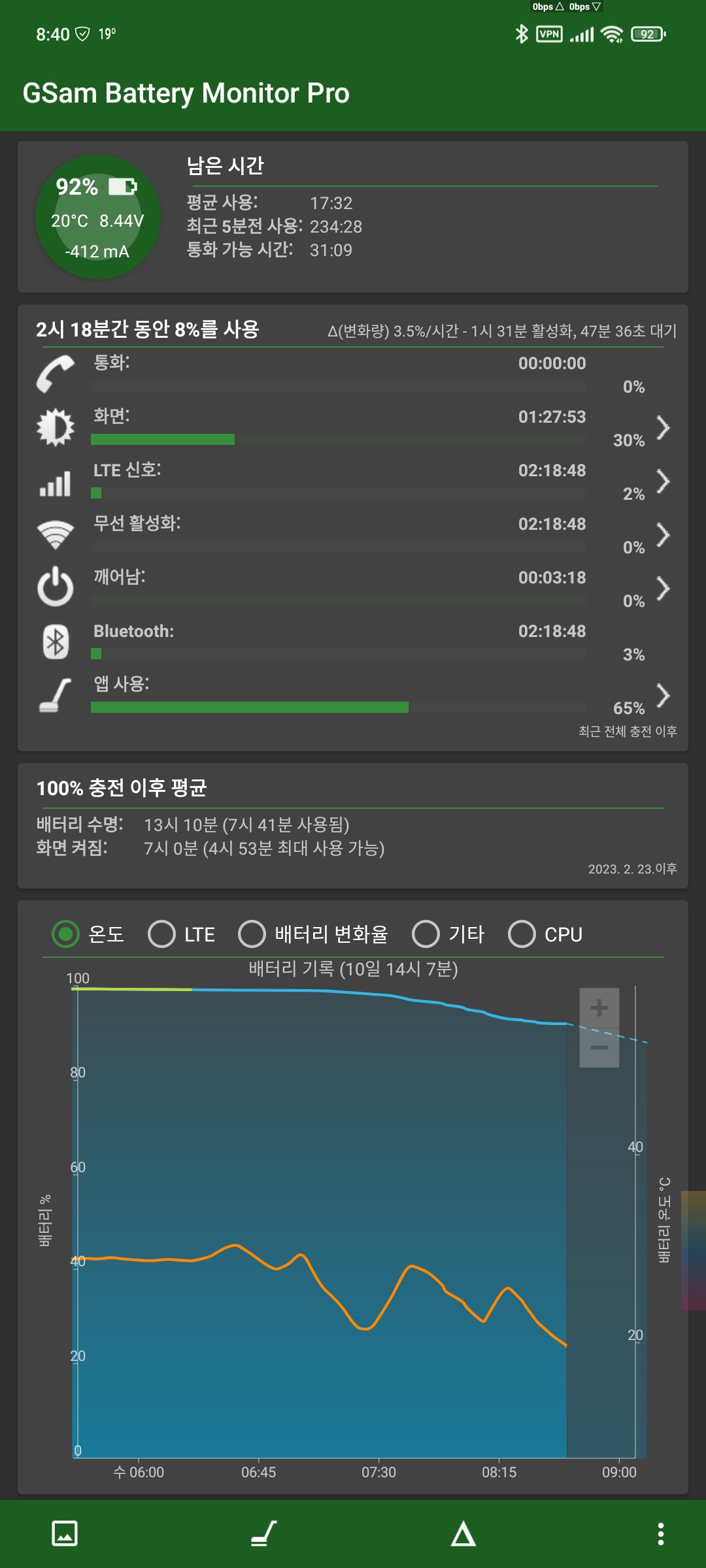 블샥4프로 기종이라 그런가 2시간 18분간 8% 소모량을 자랑하네요 +_+ㅎ