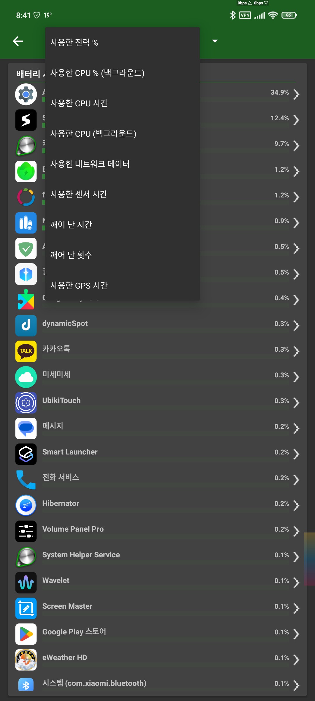 백그라운드의 어떤게 사용중이고 사용량이 많은지 적은지 % 쉽게 알수 있고 누름 앱의 세부적인 사용량까지 나옴