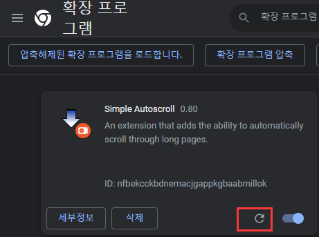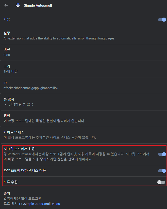 * 위 방법대로 하니까 크롬 스토어에 자동 업데이트가 되서 우측 메뉴에 "오류" 뜨기도 하네요