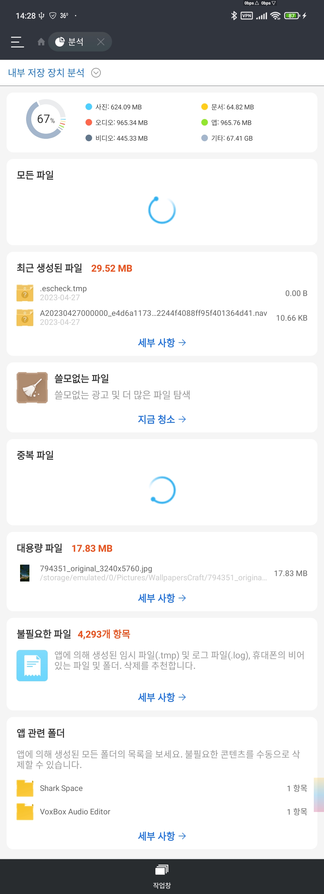 메인의 우측 분석 누르면 저장공간 분석으로 세부 내용 확인