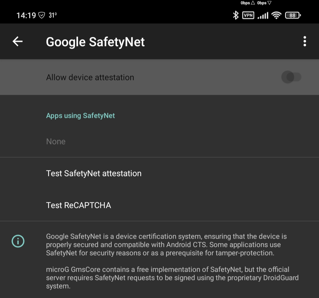 microG GmsCore에는 SafetyNet의 무료 구현이 포함되어 있지만 공식 서버는 독점 DroidGuard 사용하여 SafetyNet 요청에 서명해야 합니다. ]