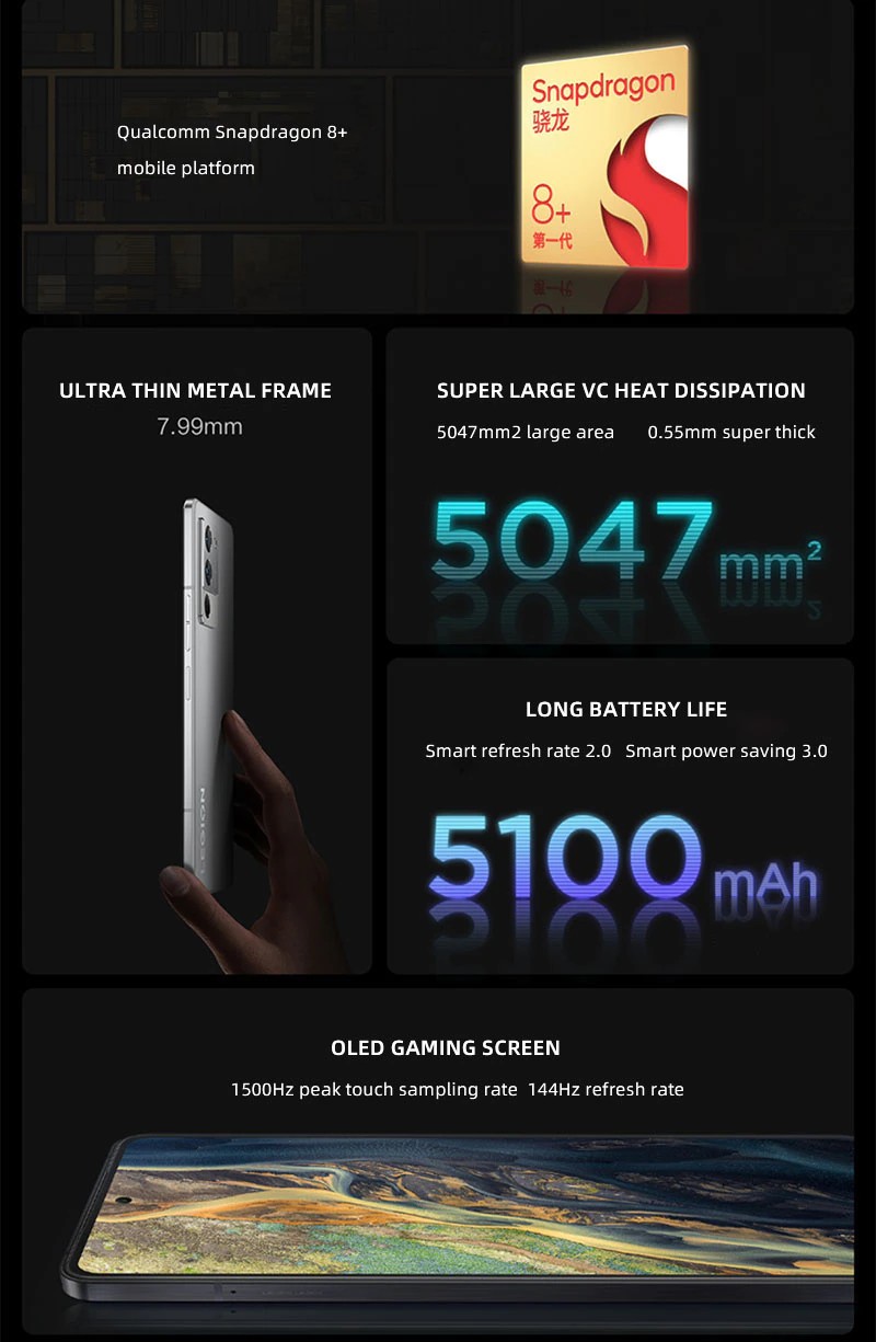 스냅드래곤 8 + 1 세대 안드로이드 12.0 OTA 6.67 "OLED 144HZ 50.0MP 카메라 68W 충전 5100mAh