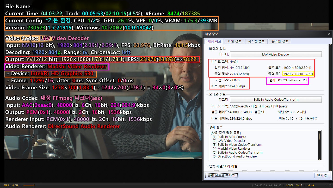 이제 재생 해보면 1080p 이상의 화질에서도 문제 없이 Madshi 코덱빨로 프레임 향상된 상태로 부드럽게 재생 됩니다
