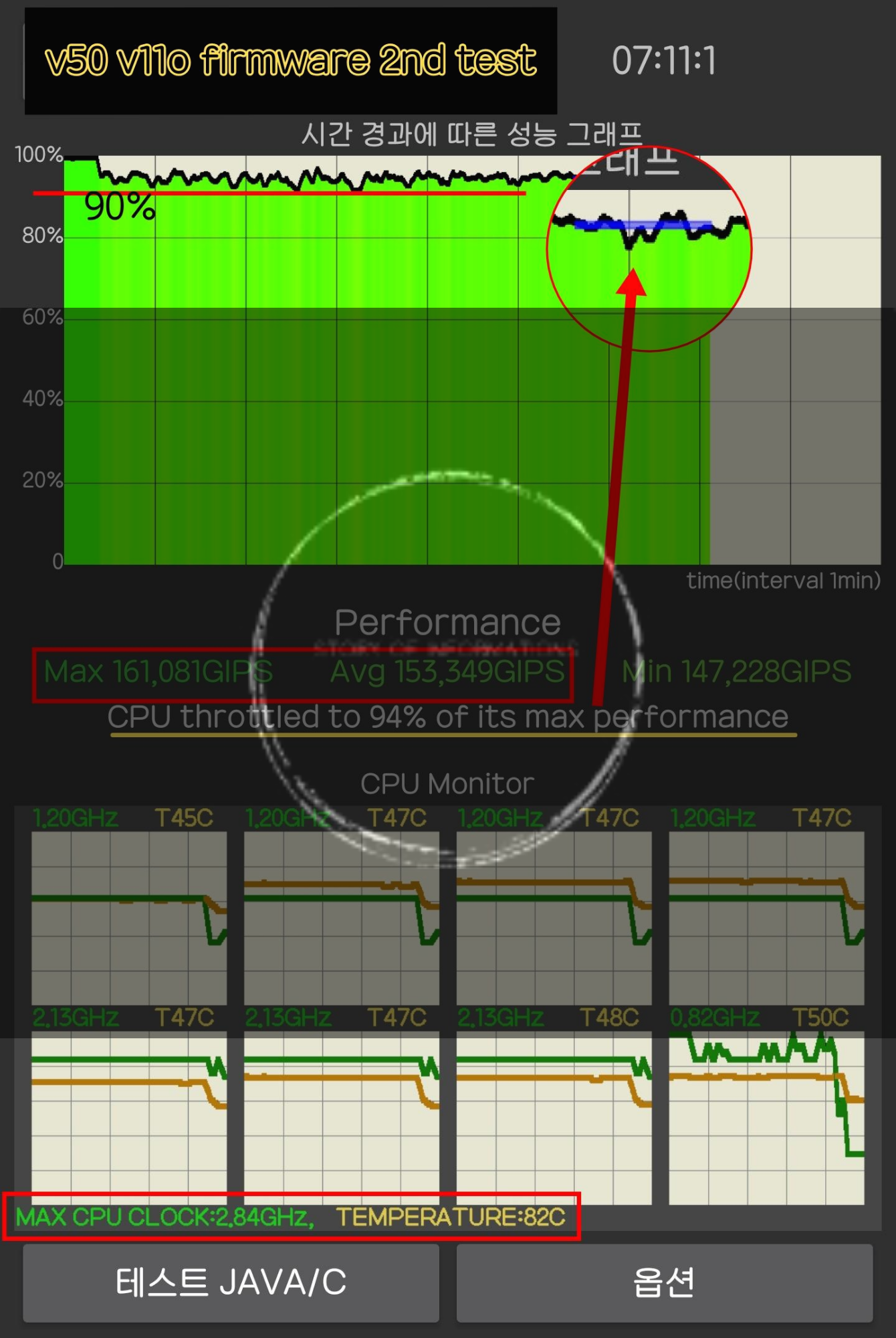 4차 테스트 결과는 역시 처음엔 95%이상의 수치를 유지하다 4분부터 80퍼 유지되는 가변성(일정 조건으로 하향 변경성)