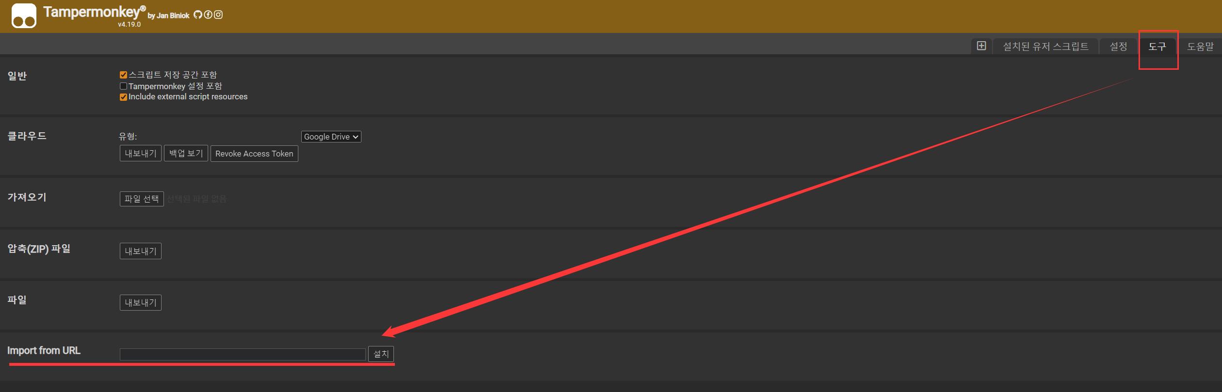 5. 유저스크립트의 2가지중 하나를 선택해서 보면 설치 방법과 URL의 JS가 보입니다 복사하시고 3번에 붙여넣기 합니다