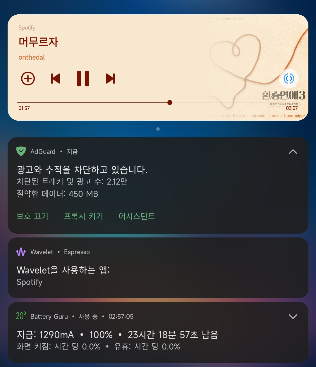 > 재생중일 때 활성화 되며 안보인다면 Wavelet+Spotify 강종 후에 Wavelet 먼저 활성화 이후 Spotify 재생하면 자동 활성화 됩니다