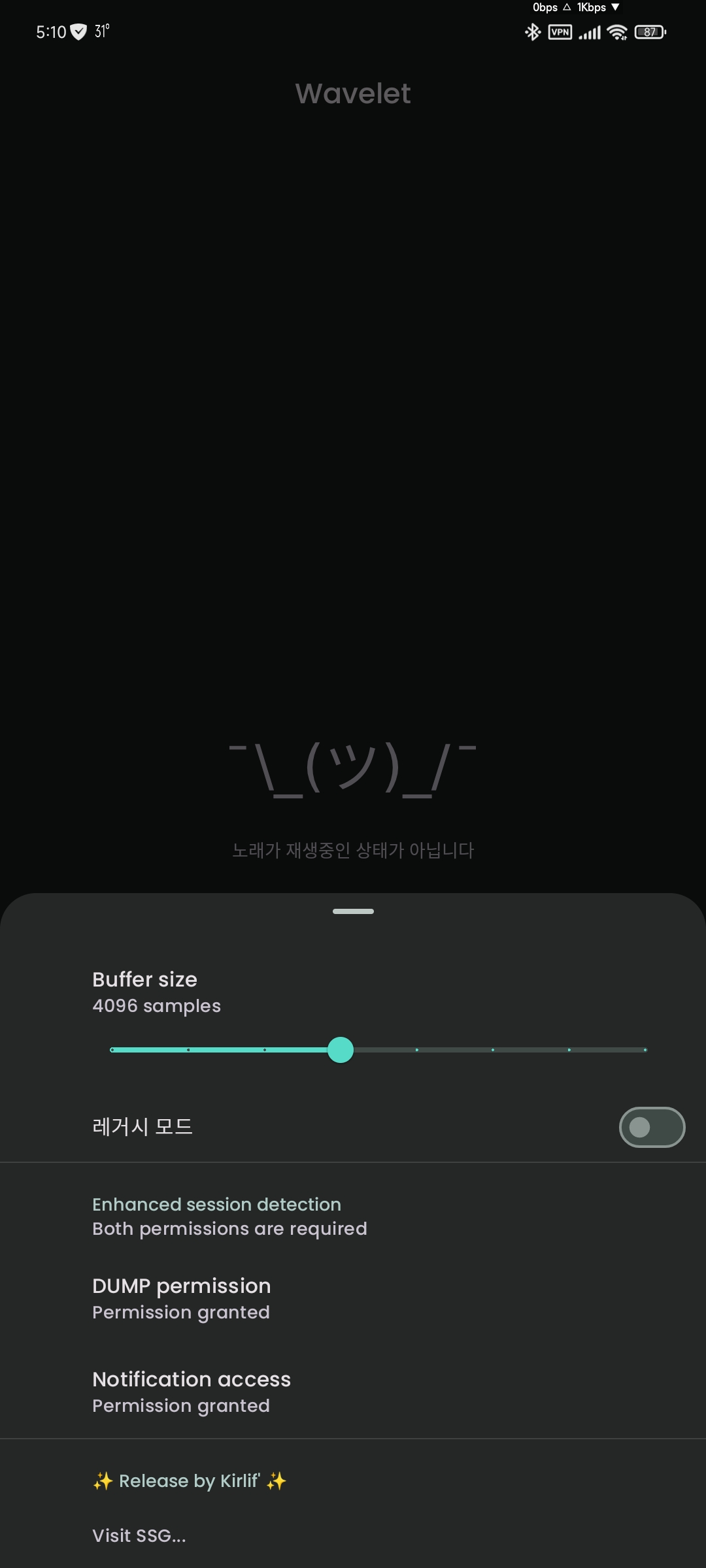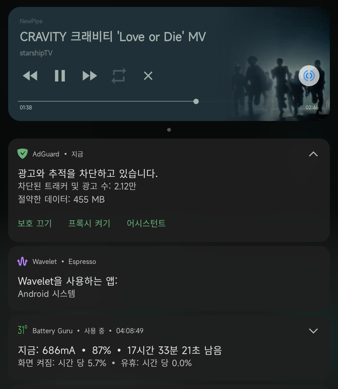 레거시-ON 상태엔 상단바에 재생중인 앱 이름이 뜨는게 아닌 "Android 시스템" 으로 보입니다