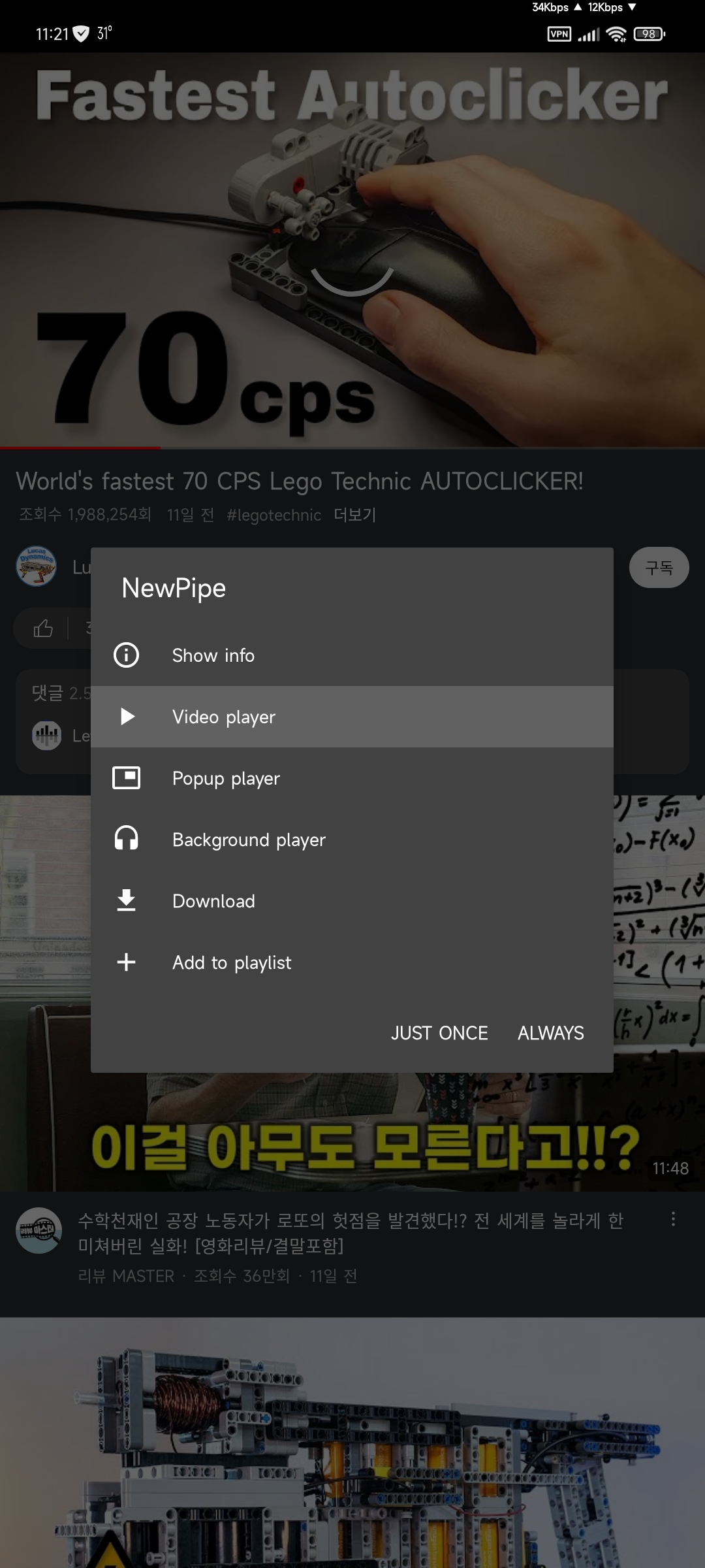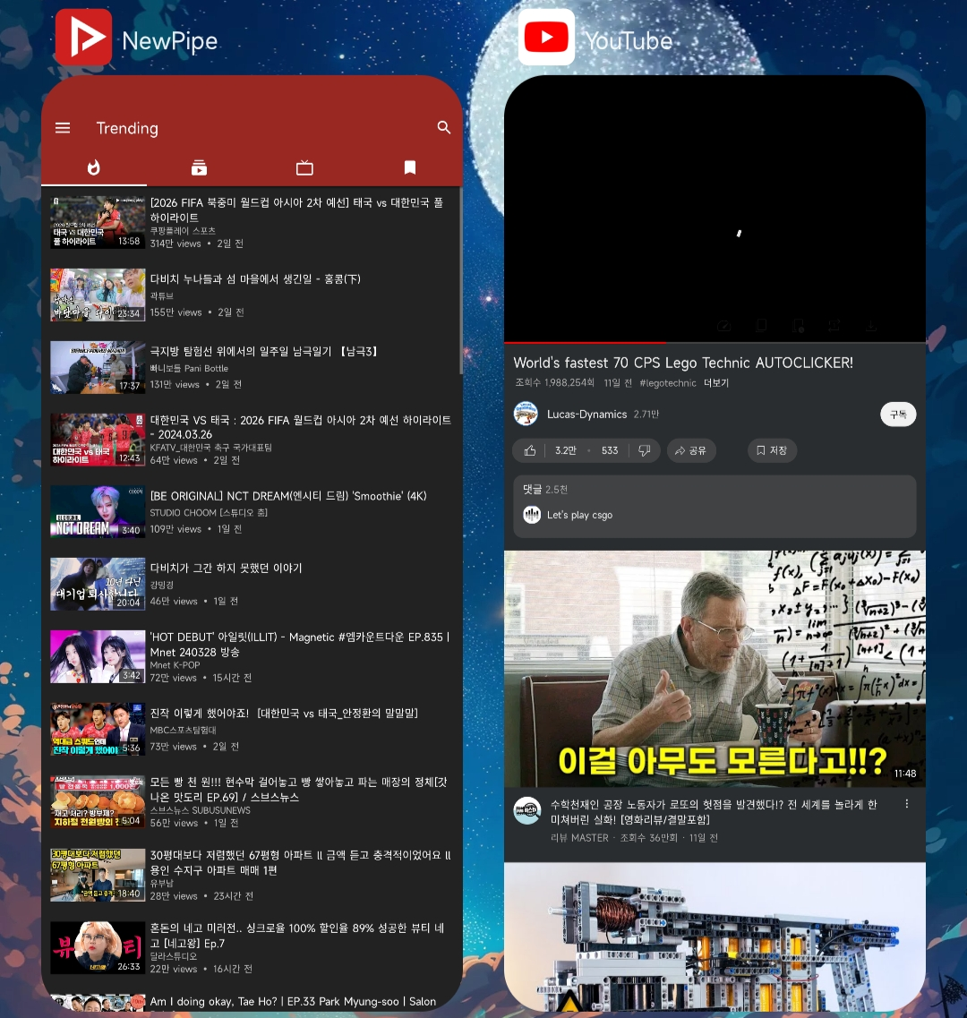 앱창고에 YMusic(단일 계정 연결 + 재생 + 다운 가능), Newpipe(계정 연결x, 재생, 다운만)