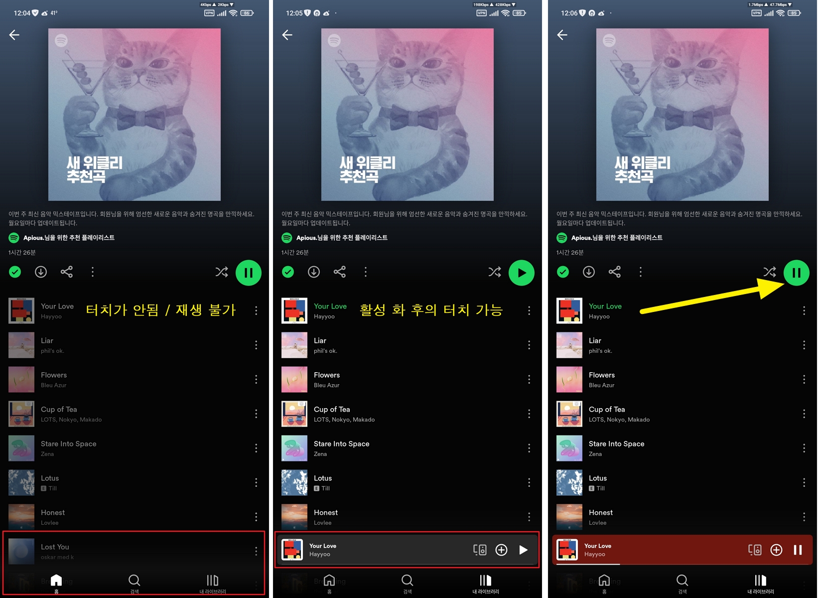 2주마다 로그인 유지 했던 방식이 변경 되었습니다 [ 이전 ] 로그아웃 >> "계정 국가" VPN 접속 >> 재 로그인 [ 이후 ] 플레이 리스트 비활성 or 재생 안됨 or 네트워크 장애 = 로그인은 유지 >> 스포티