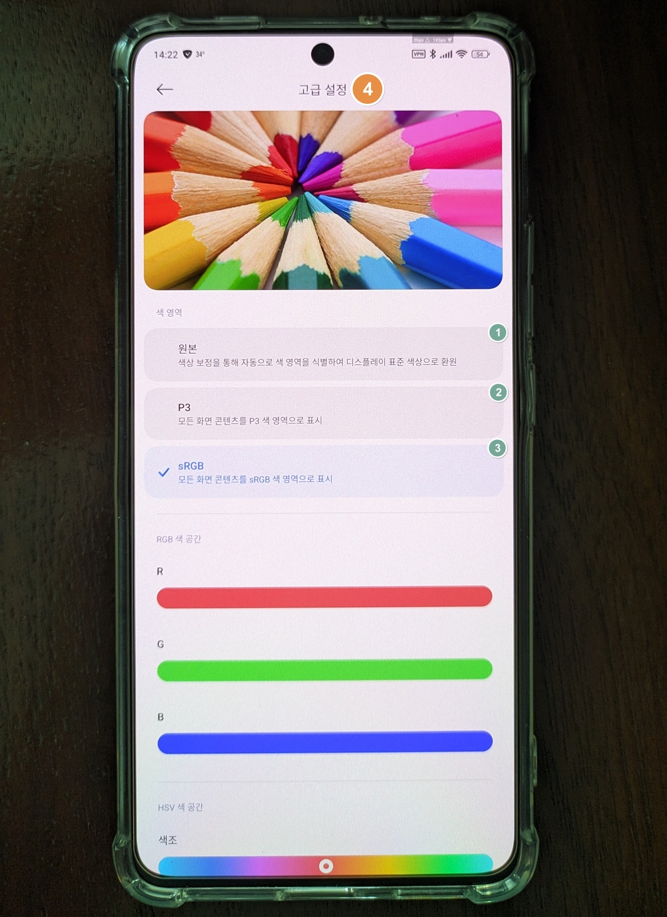 4-2의 P3는 구카의 색감 설정에서도 반영되는 방식인데 명암과 색상비가 강해서 일반적 핸폰을 볼때 색감이 강하게 느껴지지만 기본 상태의 포코 폰을 보는 것 보단 나을 것이라 생각되네요