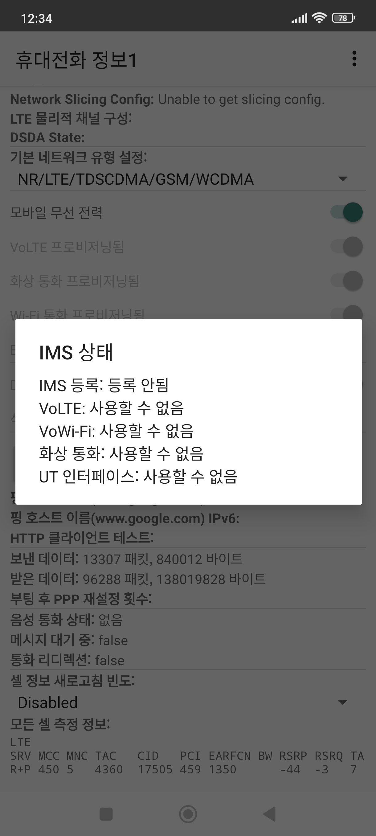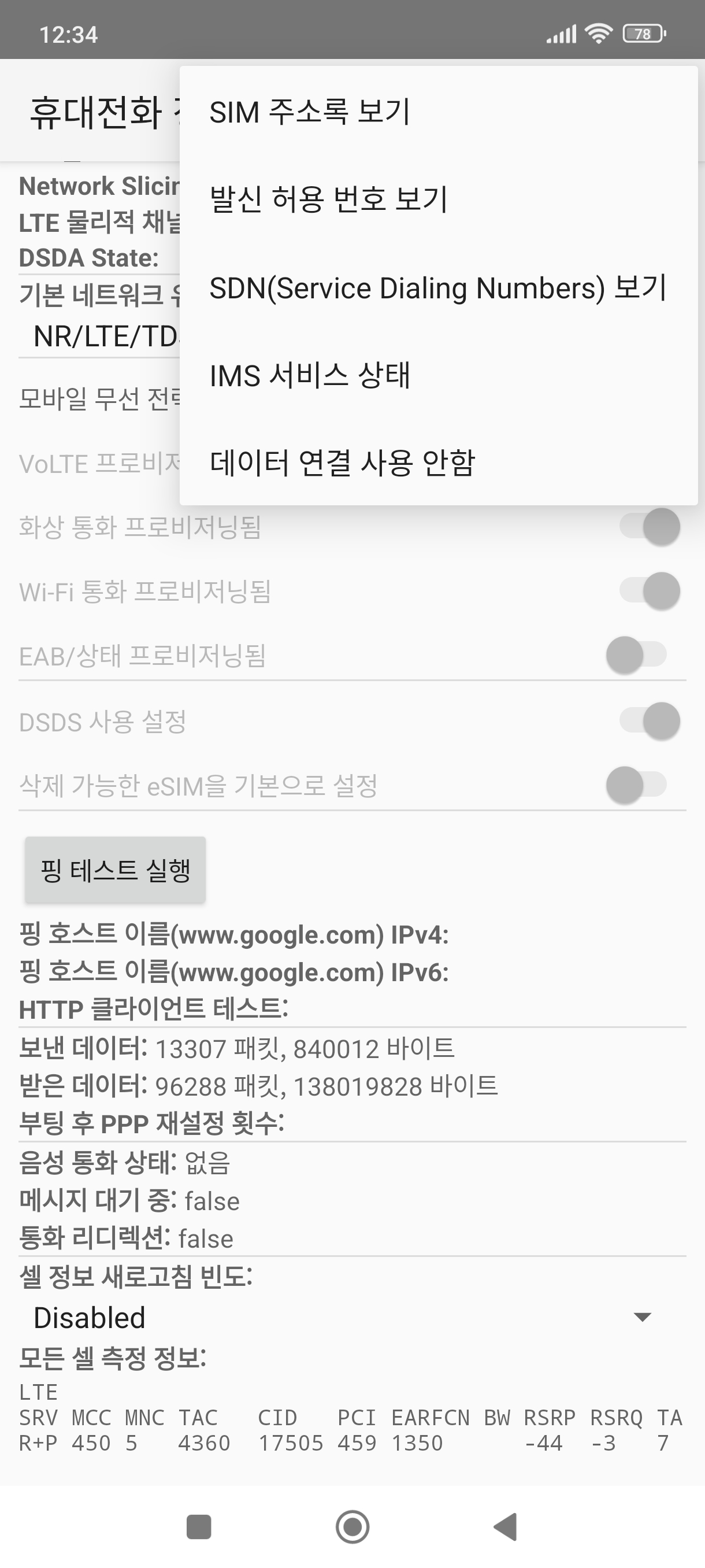 5. *#*#4636#*#* = 네트워크 정보 / 여기에서 임의 활성화는 안됨 / 부분 변경시 문제 될 수 있으니 참고용으로만 보세요