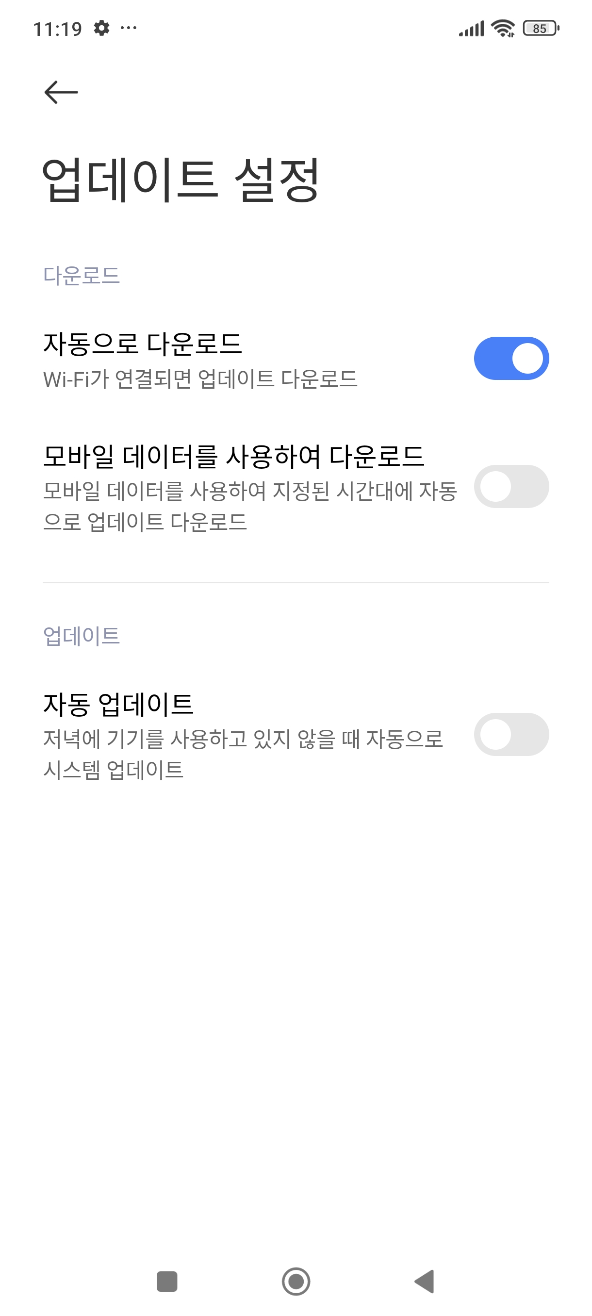 - OTA 업데이트 ON 빼고는 모두 OFF
