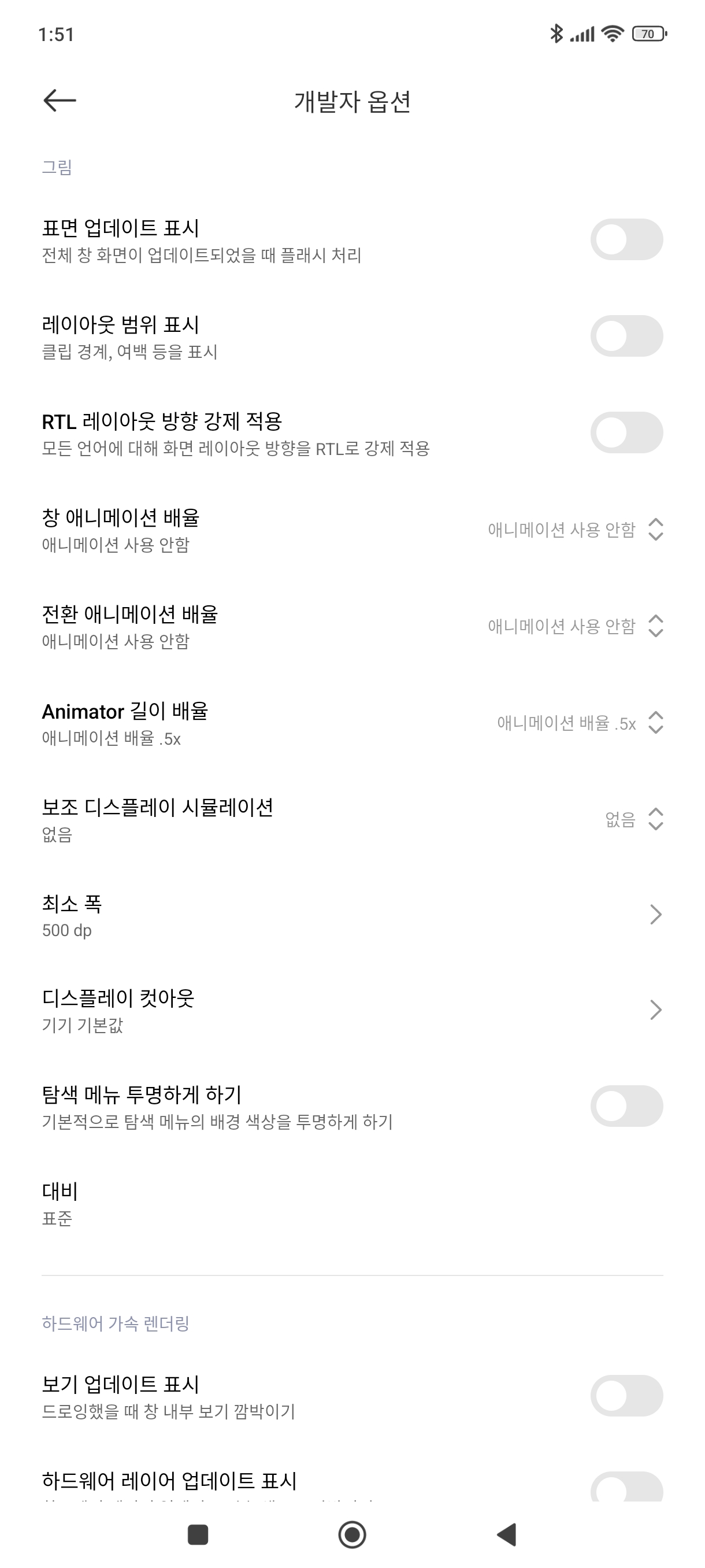 - 개발자 옵션의 [애니메이션 설정] + [최소 폭] 권장 : 490