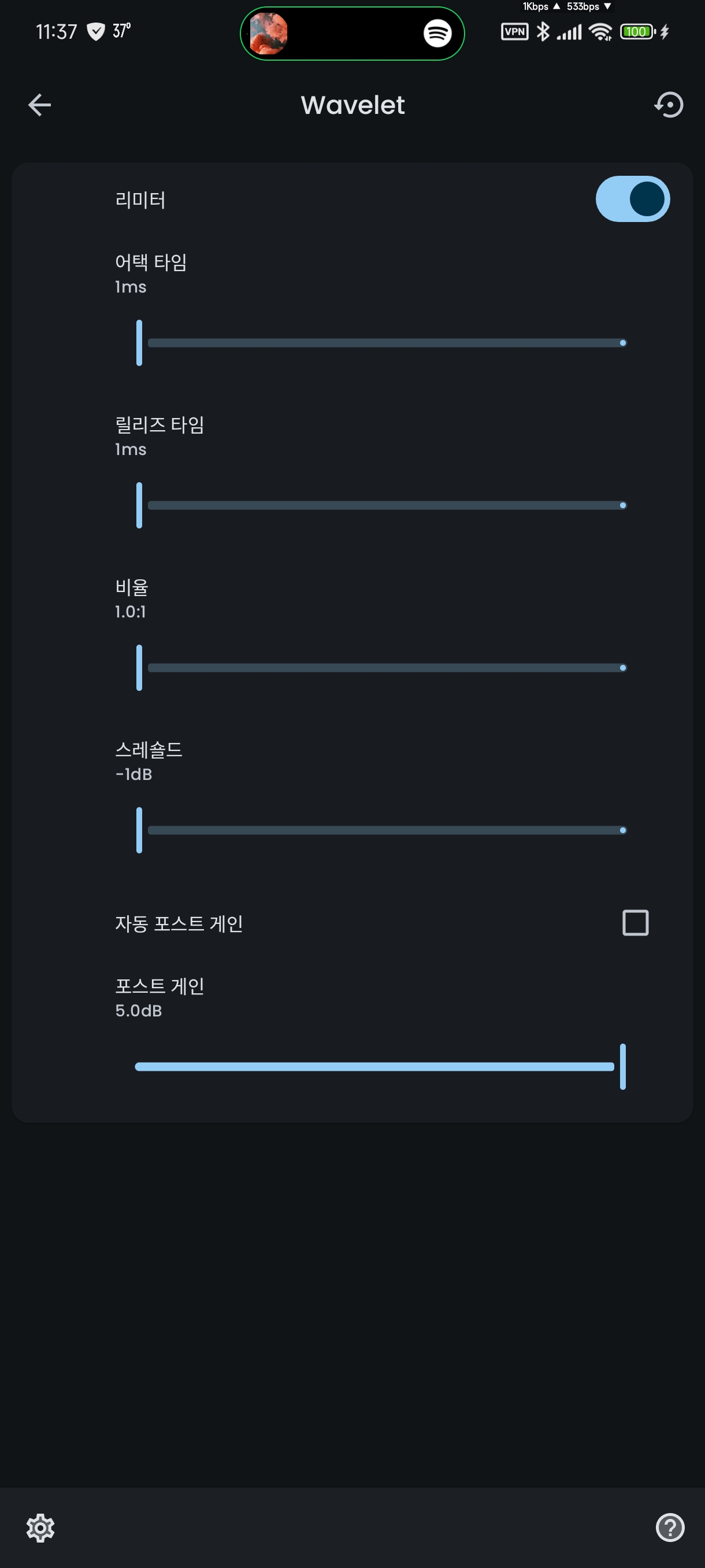 포스트게인 의 임계값이 스레숄드 값에 따라 감소되고 릴리즈타임 + 어택 타임을 "비율" 에 의해 조절이 되는데