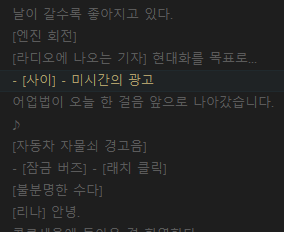이건 영문 원문 자막에 SDH의 청각 장애인을 위한 주변 환경 등을 글자로 [ ~ ] 표시해둔 것