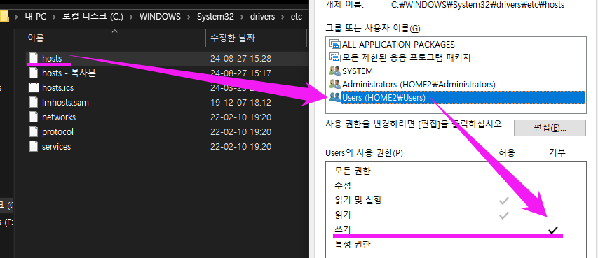 보통 hosts 파일을 내 문서로 복사 후 수정 후 경로에 기존 파일 삭제 후 복붙 하고 위와 같이 잠궈 둡니다