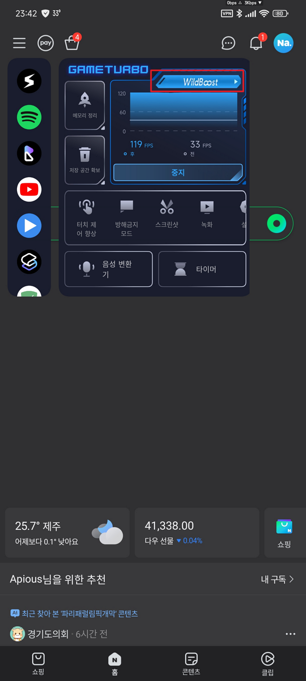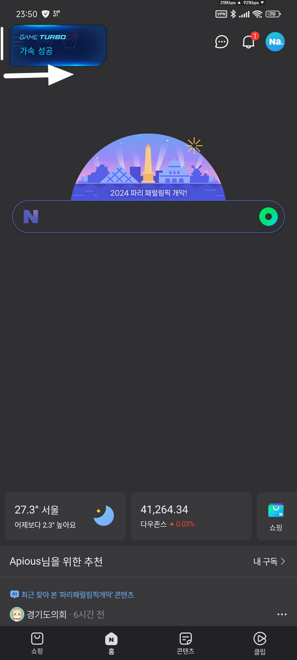 - 적용된 경우 왼쪽 상단에 [Game Turbo 가속 성공] 표시되고 흰색 "바" 표시되며 화살 방향으로 드래그 하면 아래와 같이 표시 되요