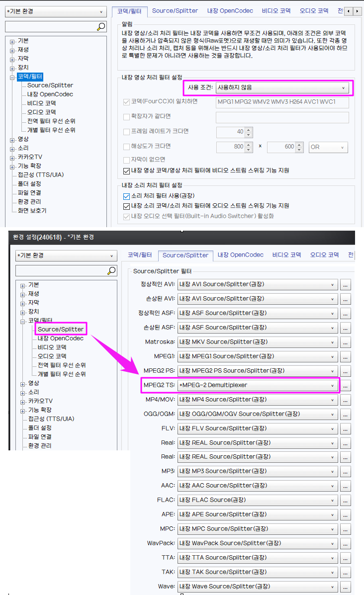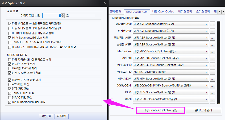- 소스/스플릿터 = 이게 영상 밀리거나 소리는 나오는데 영상이 멈춰서 지연되거나 깨지는 문제