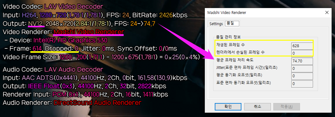 - H264 영상의 24fps, 드롭된 프레임이 없이 영상 그대로의 프레임대로 재생 됩니다