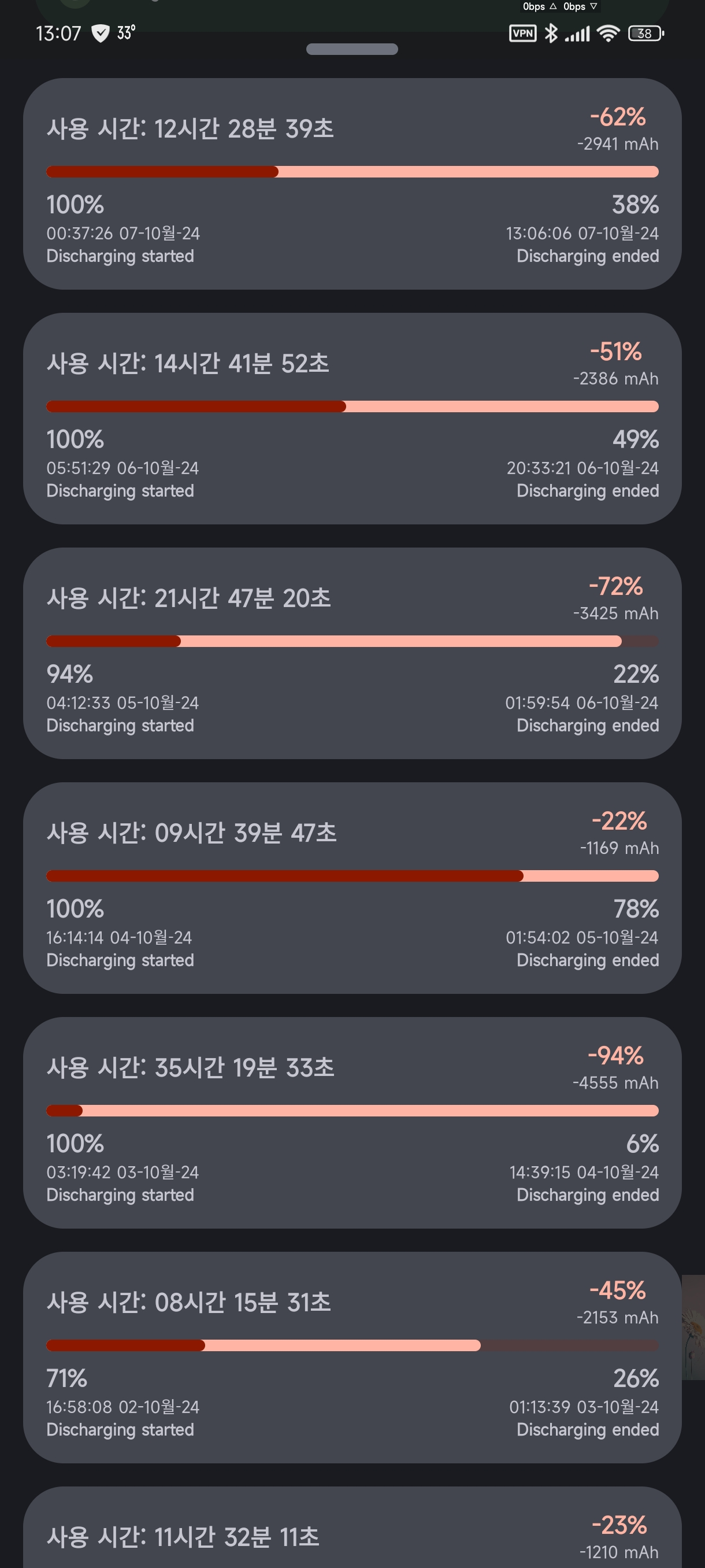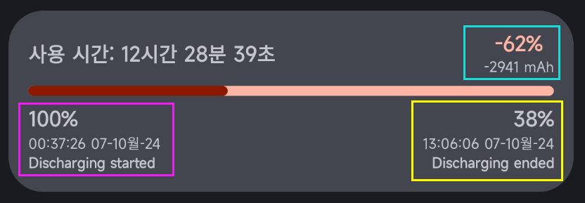 2. 분홍색 : 충전된 100% 기록 시작으로 00:37분:26초 / 일-월-년 : 24년10월7일 / 미충전에서 기록 시작