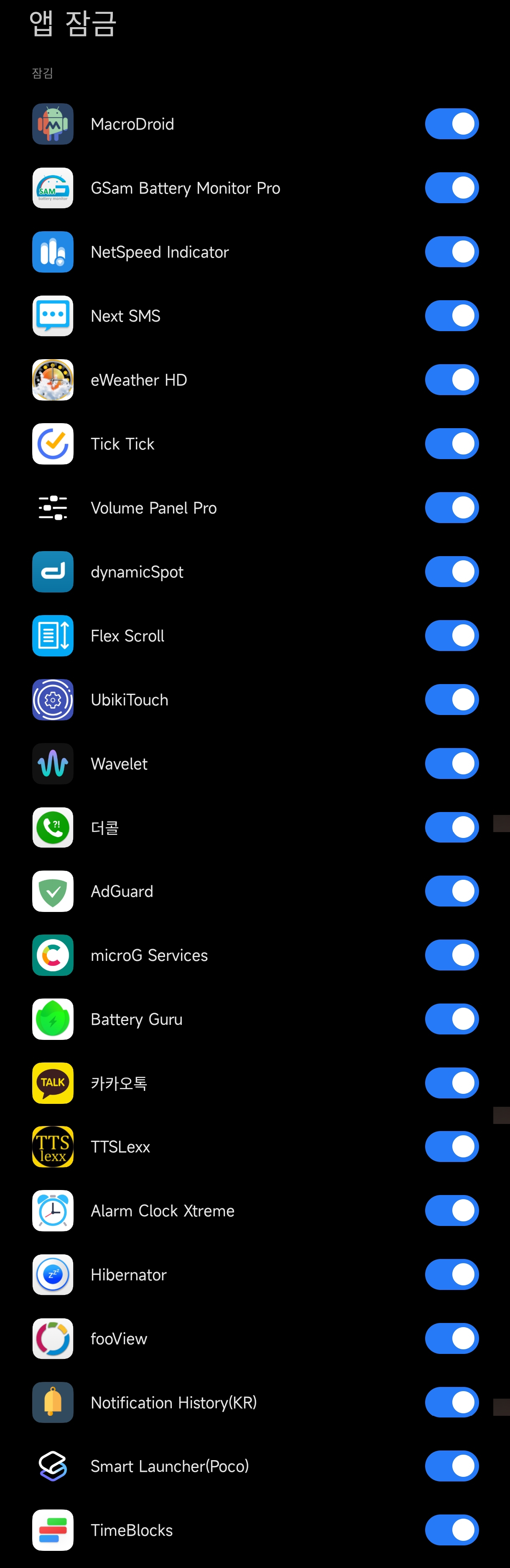 - 보안앱 내 속도가속의 절전 예외(화면 잠금 후 몇분 뒤 자동 캐시 정리 예외 항목)