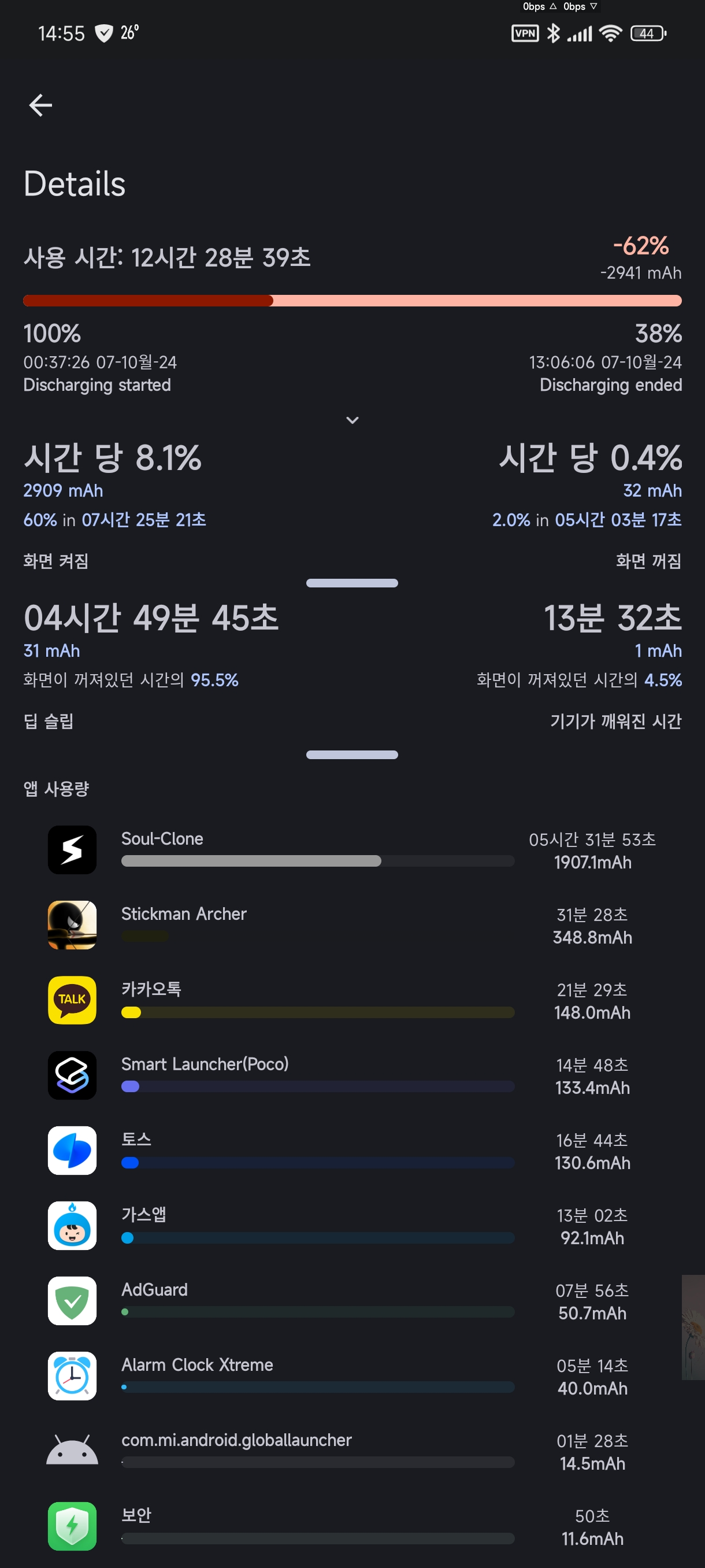 1. 화면 켜짐 = 7시간25분 간 = 60% 화면켜짐 사용됨 = 통계 1시간 = 8.1% / 2909mah 사용됨