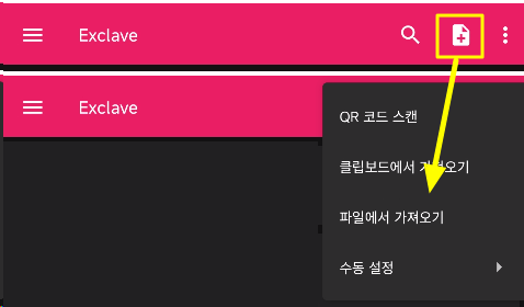 5. 다운로드 파일을 Exclave 앱에서 추가 합니다 // 파일 or QR