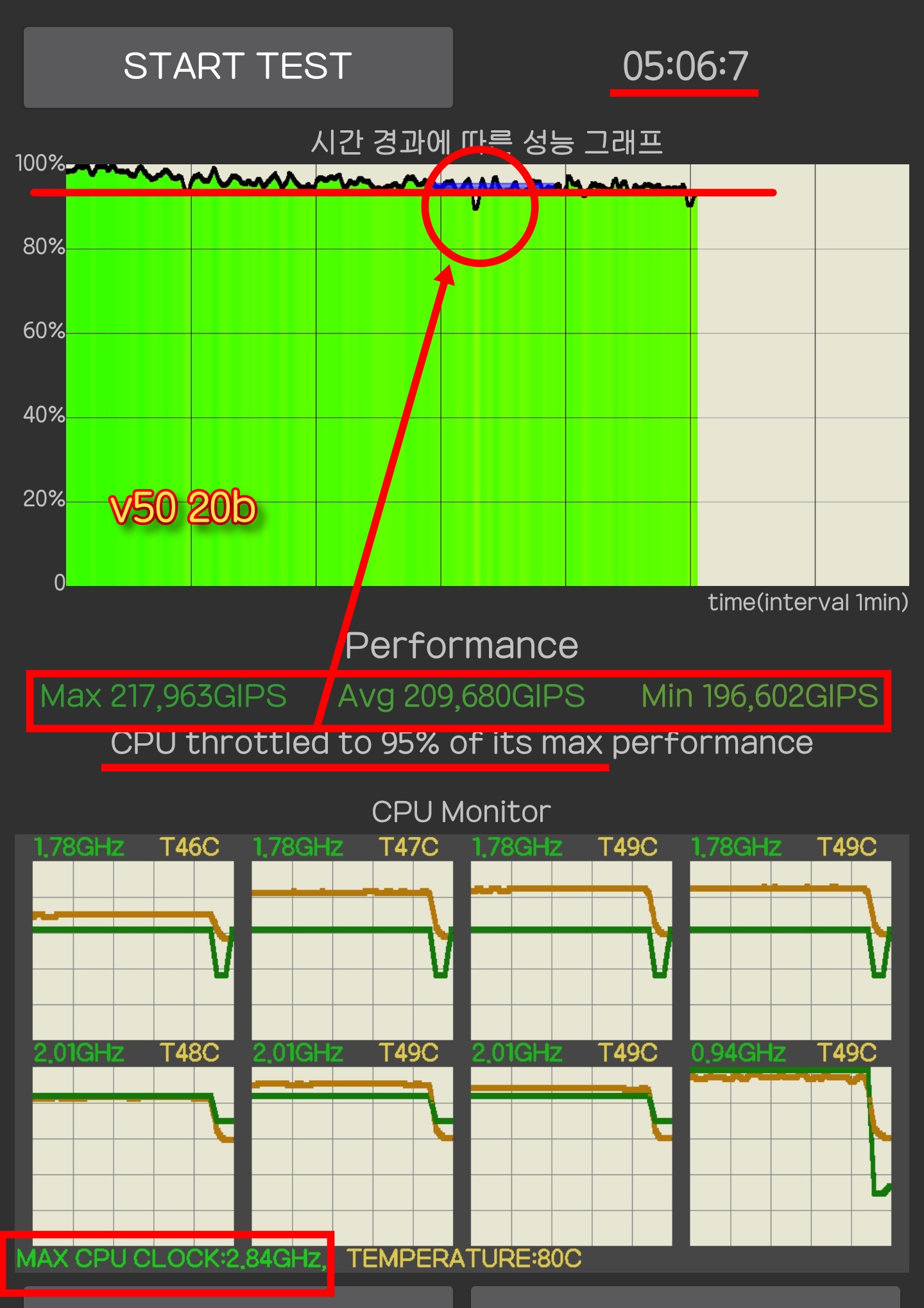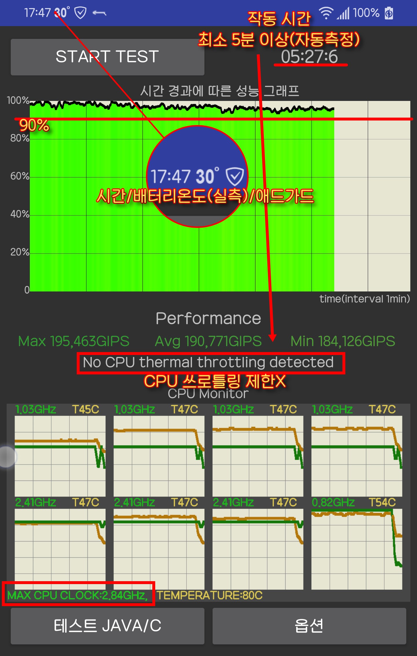 2. 테스트 과정 : a로 측정 > test java 2회 시도(시동 : 오차를 줄이기 위함) > 화면꺼짐 10분 > 앱킬 : 기타 방해요소 제거 > 쓰로틀링 체크 결과 1차 2차 3차 후 최종 결과 수치가 이전과 다름 없을 경우 공개