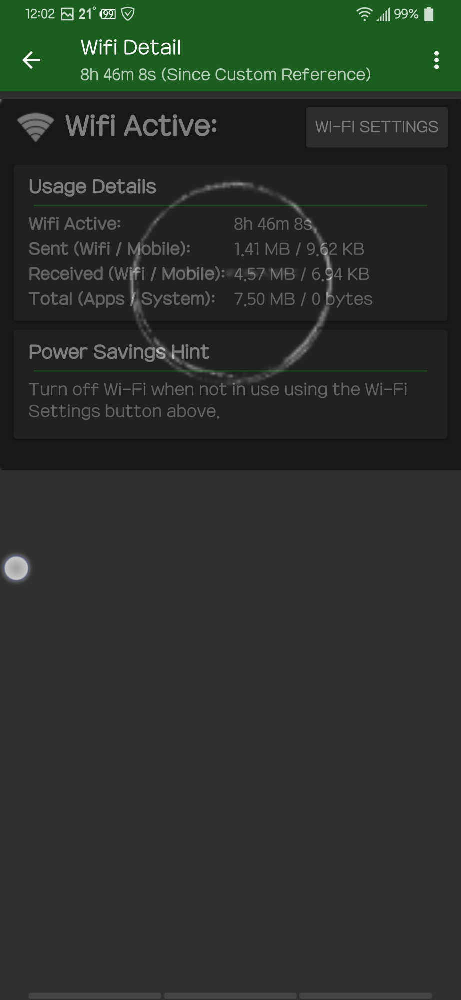 무선 사용 8시간 46분 8초 / (wifi/LTE)보냄 : 1.41MB/9.62KB, 받음 : 4.57MB/6.94KB = 앱에서 사용된 량 : 7.50MB
