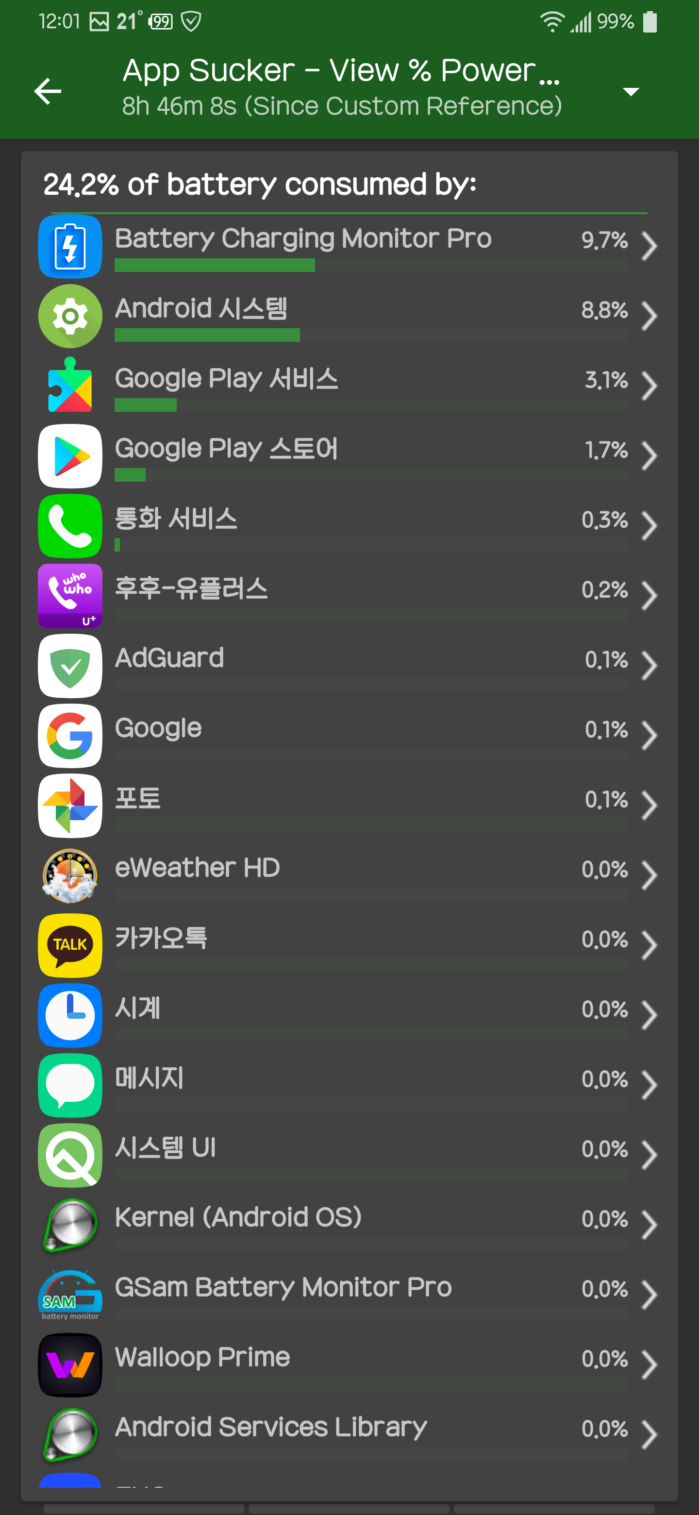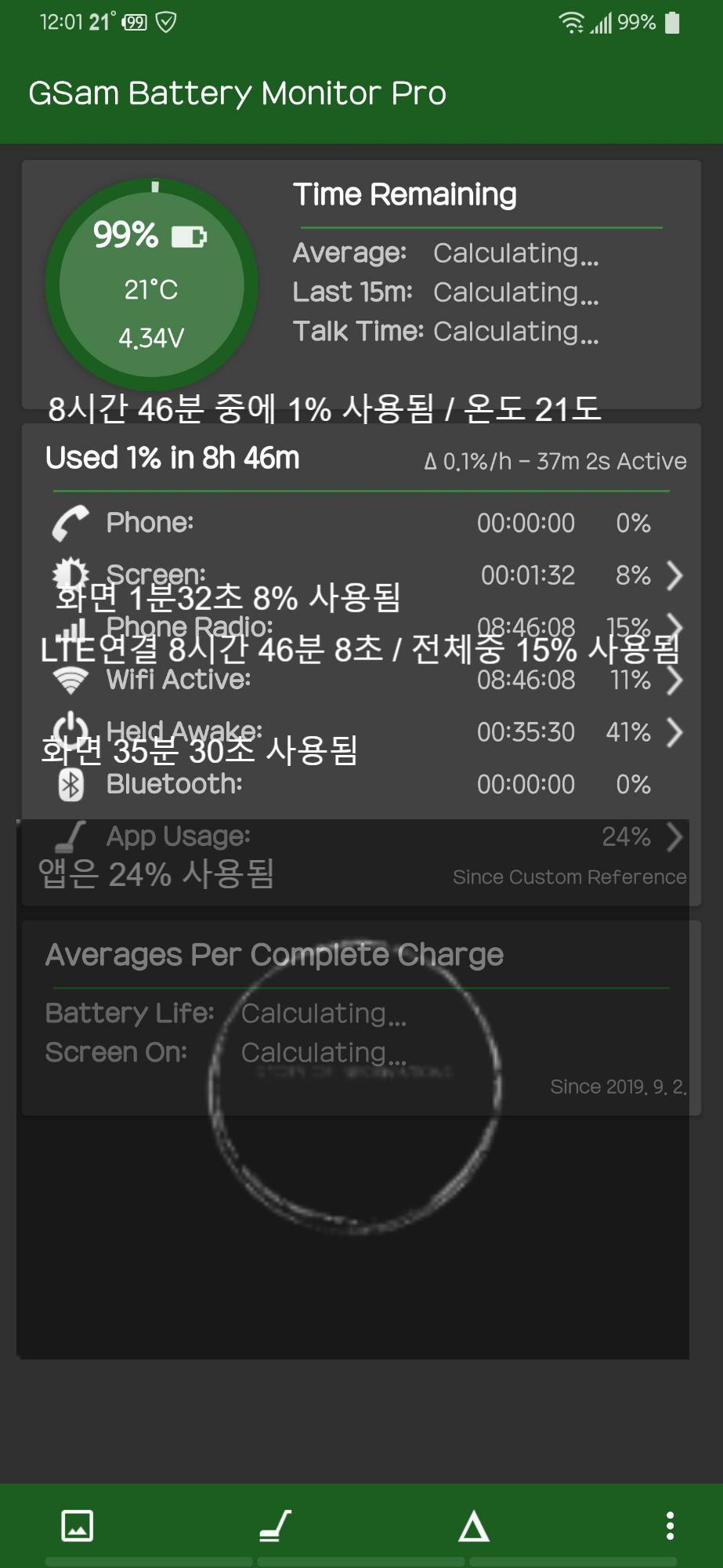 - 8시간 46분 동안 1% 배터리 소모